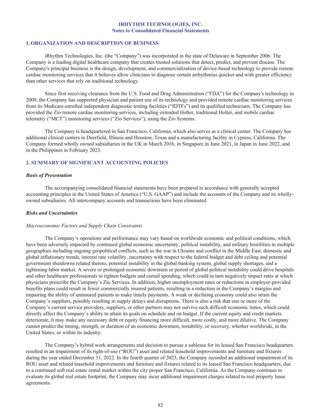 IRHYTHM TECHNOLOGIES, INC. Notes to Consolidated Financial Statements 1. ORGANIZATION AND DESCRIPTION OF BUSINESS iRhythm Technologies, Inc. (the “Company”) was incorporated in the state of Delaware in September 2006. The Company is a leading digital healthcare company that creates trusted solutions that detect, predict, and prevent disease. The Company's principal business is the design, development, and commercialization of device-based technology to provide remote cardiac monitoring services that it believes allow clinicians to diagnose certain arrhythmias quicker and with greater efficiency than other services that rely on traditional technology. Since first receiving clearance from the U.S. Food and Drug Administration (“FDA”) for the Company's technology in 2009, the Company has supported physician and patient use of its technology and provided remote cardiac monitoring services from its Medicare-enrolled independent diagnostic testing facilities (“IDTFs”) and its qualified technicians. The Company has provided the Zio remote cardiac monitoring services, including extended Holter, traditional Holter, and mobile cardiac telemetry (“MCT”) monitoring services (“Zio Services”), using the Zio Systems. The Company is headquartered in San Francisco, California, which also serves as a clinical center. The Company has additional clinical centers in Deerfield, Illinois and Houston, Texas and a manufacturing facility in Cypress, California. The Company formed wholly owned subsidiaries in the UK in March 2016, in Singapore in June 2021, in Japan in June 2022, and in the Philippines in February 2023. 2. SUMMARY OF SIGNIFICANT ACCOUNTING POLICIES Basis of Presentation The accompanying consolidated financial statements have been prepared in accordance with generally accepted accounting principles in the United States of America (“U.S. GAAP”) and include the accounts of the Company and its wholly- owned subsidiaries. All intercompany accounts and transactions have been eliminated. Risks and Uncertainties Macroeconomic Factors and Supply Chain Constraints The Company’s operations and performance may vary based on worldwide economic and political conditions, which have been adversely impacted by continued global economic uncertainty, political instability, and military hostilities in multiple geographies including ongoing geopolitical conflicts, such as the war in Ukraine and conflict in the Middle East, domestic and global inflationary trends, interest rate volatility, uncertainty with respect to the federal budget and debt ceiling and potential government shutdowns related thereto, potential instability in the global banking system, global supply shortages, and a tightening labor market. A severe or prolonged economic downturn or period of global political instability could drive hospitals and other healthcare professionals to tighten budgets and curtail spending, which could in turn negatively impact rates at which physicians prescribe the Company’s Zio Services. In addition, higher unemployment rates or reductions in employer-provided benefits plans could result in fewer commercially insured patients, resulting in a reduction in the Company’s margins and impairing the ability of uninsured patients to make timely payments. A weak or declining economy could also strain the Company’s suppliers, possibly resulting in supply delays and disruptions. There is also a risk that one or more of the Company’s current service providers, suppliers, or other partners may not survive such difficult economic times, which could directly affect the Company’s ability to attain its goals on schedule and on budget. If the current equity and credit markets deteriorate, it may make any necessary debt or equity financing more difficult, more costly, and more dilutive. The Company cannot predict the timing, strength, or duration of an economic downturn, instability, or recovery, whether worldwide, in the United States, or within its industry. The Company’s hybrid work arrangements and decision to pursue a sublease for its leased San Francisco headquarters resulted in an impairment of its right-of-use (“ROU”) asset and related leasehold improvements and furniture and fixtures during the year ended December 31, 2022. In the fourth quarter of 2023, the Company recorded an additional impairment of its ROU asset and related leasehold improvements and furniture and fixtures related to its leased San Francisco headquarters, due to a continued soft real estate rental market within the city proper San Francisco, California. As the Company continues to evaluate its global real estate footprint, the Company may incur additional impairment charges related to real property lease agreements. 82