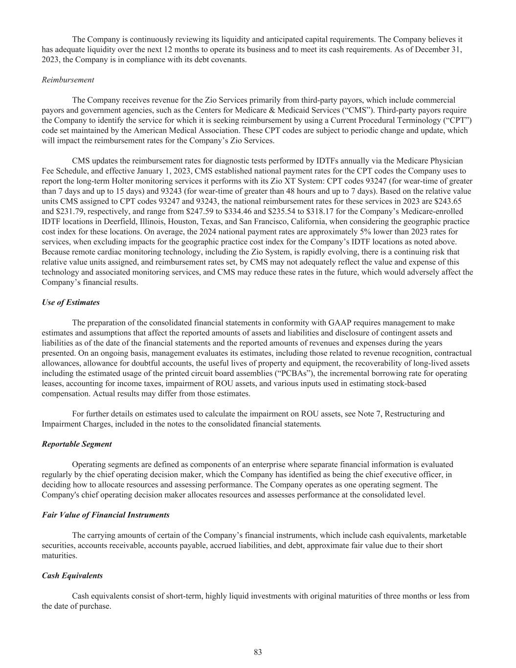 The Company is continuously reviewing its liquidity and anticipated capital requirements. The Company believes it has adequate liquidity over the next 12 months to operate its business and to meet its cash requirements. As of December 31, 2023, the Company is in compliance with its debt covenants. Reimbursement The Company receives revenue for the Zio Services primarily from third-party payors, which include commercial payors and government agencies, such as the Centers for Medicare & Medicaid Services (“CMS”). Third-party payors require the Company to identify the service for which it is seeking reimbursement by using a Current Procedural Terminology (“CPT”) code set maintained by the American Medical Association. These CPT codes are subject to periodic change and update, which will impact the reimbursement rates for the Company’s Zio Services. CMS updates the reimbursement rates for diagnostic tests performed by IDTFs annually via the Medicare Physician Fee Schedule, and effective January 1, 2023, CMS established national payment rates for the CPT codes the Company uses to report the long-term Holter monitoring services it performs with its Zio XT System: CPT codes 93247 (for wear-time of greater than 7 days and up to 15 days) and 93243 (for wear-time of greater than 48 hours and up to 7 days). Based on the relative value units CMS assigned to CPT codes 93247 and 93243, the national reimbursement rates for these services in 2023 are $243.65 and $231.79, respectively, and range from $247.59 to $334.46 and $235.54 to $318.17 for the Company’s Medicare-enrolled IDTF locations in Deerfield, Illinois, Houston, Texas, and San Francisco, California, when considering the geographic practice cost index for these locations. On average, the 2024 national payment rates are approximately 5% lower than 2023 rates for services, when excluding impacts for the geographic practice cost index for the Company’s IDTF locations as noted above. Because remote cardiac monitoring technology, including the Zio System, is rapidly evolving, there is a continuing risk that relative value units assigned, and reimbursement rates set, by CMS may not adequately reflect the value and expense of this technology and associated monitoring services, and CMS may reduce these rates in the future, which would adversely affect the Company’s financial results. Use of Estimates The preparation of the consolidated financial statements in conformity with GAAP requires management to make estimates and assumptions that affect the reported amounts of assets and liabilities and disclosure of contingent assets and liabilities as of the date of the financial statements and the reported amounts of revenues and expenses during the years presented. On an ongoing basis, management evaluates its estimates, including those related to revenue recognition, contractual allowances, allowance for doubtful accounts, the useful lives of property and equipment, the recoverability of long-lived assets including the estimated usage of the printed circuit board assemblies (“PCBAs”), the incremental borrowing rate for operating leases, accounting for income taxes, impairment of ROU assets, and various inputs used in estimating stock-based compensation. Actual results may differ from those estimates. For further details on estimates used to calculate the impairment on ROU assets, see Note 7, Restructuring and Impairment Charges, included in the notes to the consolidated financial statements. Reportable Segment Operating segments are defined as components of an enterprise where separate financial information is evaluated regularly by the chief operating decision maker, which the Company has identified as being the chief executive officer, in deciding how to allocate resources and assessing performance. The Company operates as one operating segment. The Company's chief operating decision maker allocates resources and assesses performance at the consolidated level. Fair Value of Financial Instruments The carrying amounts of certain of the Company’s financial instruments, which include cash equivalents, marketable securities, accounts receivable, accounts payable, accrued liabilities, and debt, approximate fair value due to their short maturities. Cash Equivalents Cash equivalents consist of short-term, highly liquid investments with original maturities of three months or less from the date of purchase. 83