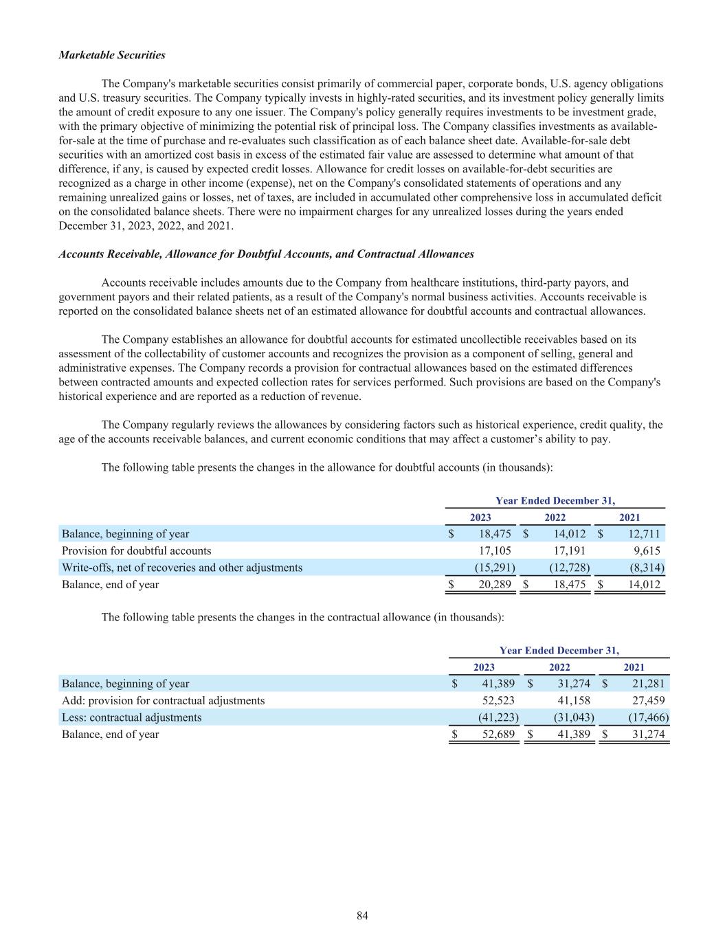 Marketable Securities The Company's marketable securities consist primarily of commercial paper, corporate bonds, U.S. agency obligations and U.S. treasury securities. The Company typically invests in highly-rated securities, and its investment policy generally limits the amount of credit exposure to any one issuer. The Company's policy generally requires investments to be investment grade, with the primary objective of minimizing the potential risk of principal loss. The Company classifies investments as available- for-sale at the time of purchase and re-evaluates such classification as of each balance sheet date. Available-for-sale debt securities with an amortized cost basis in excess of the estimated fair value are assessed to determine what amount of that difference, if any, is caused by expected credit losses. Allowance for credit losses on available-for-debt securities are recognized as a charge in other income (expense), net on the Company's consolidated statements of operations and any remaining unrealized gains or losses, net of taxes, are included in accumulated other comprehensive loss in accumulated deficit on the consolidated balance sheets. There were no impairment charges for any unrealized losses during the years ended December 31, 2023, 2022, and 2021. Accounts Receivable, Allowance for Doubtful Accounts, and Contractual Allowances Accounts receivable includes amounts due to the Company from healthcare institutions, third-party payors, and government payors and their related patients, as a result of the Company's normal business activities. Accounts receivable is reported on the consolidated balance sheets net of an estimated allowance for doubtful accounts and contractual allowances. The Company establishes an allowance for doubtful accounts for estimated uncollectible receivables based on its assessment of the collectability of customer accounts and recognizes the provision as a component of selling, general and administrative expenses. The Company records a provision for contractual allowances based on the estimated differences between contracted amounts and expected collection rates for services performed. Such provisions are based on the Company's historical experience and are reported as a reduction of revenue. The Company regularly reviews the allowances by considering factors such as historical experience, credit quality, the age of the accounts receivable balances, and current economic conditions that may affect a customer’s ability to pay. The following table presents the changes in the allowance for doubtful accounts (in thousands): Year Ended December 31, 2023 2022 2021 Balance, beginning of year $ 18,475 $ 14,012 $ 12,711 Provision for doubtful accounts 17,105 17,191 9,615 Write-offs, net of recoveries and other adjustments (15,291) (12,728) (8,314) Balance, end of year $ 20,289 $ 18,475 $ 14,012 The following table presents the changes in the contractual allowance (in thousands): Year Ended December 31, 2023 2022 2021 Balance, beginning of year $ 41,389 $ 31,274 $ 21,281 Add: provision for contractual adjustments 52,523 41,158 27,459 Less: contractual adjustments (41,223) (31,043) (17,466) Balance, end of year $ 52,689 $ 41,389 $ 31,274 84