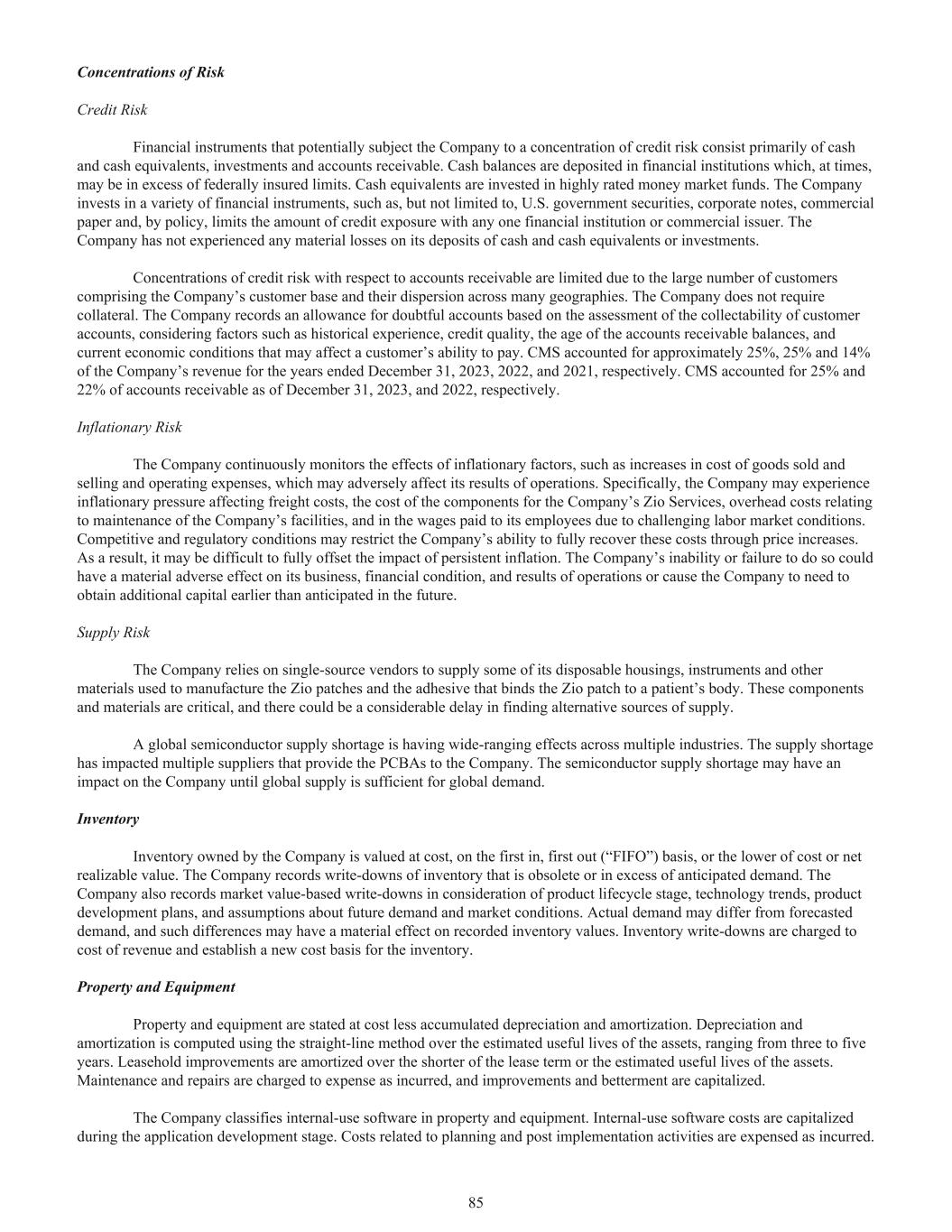 Concentrations of Risk Credit Risk Financial instruments that potentially subject the Company to a concentration of credit risk consist primarily of cash and cash equivalents, investments and accounts receivable. Cash balances are deposited in financial institutions which, at times, may be in excess of federally insured limits. Cash equivalents are invested in highly rated money market funds. The Company invests in a variety of financial instruments, such as, but not limited to, U.S. government securities, corporate notes, commercial paper and, by policy, limits the amount of credit exposure with any one financial institution or commercial issuer. The Company has not experienced any material losses on its deposits of cash and cash equivalents or investments. Concentrations of credit risk with respect to accounts receivable are limited due to the large number of customers comprising the Company’s customer base and their dispersion across many geographies. The Company does not require collateral. The Company records an allowance for doubtful accounts based on the assessment of the collectability of customer accounts, considering factors such as historical experience, credit quality, the age of the accounts receivable balances, and current economic conditions that may affect a customer’s ability to pay. CMS accounted for approximately 25%, 25% and 14% of the Company’s revenue for the years ended December 31, 2023, 2022, and 2021, respectively. CMS accounted for 25% and 22% of accounts receivable as of December 31, 2023, and 2022, respectively. Inflationary Risk The Company continuously monitors the effects of inflationary factors, such as increases in cost of goods sold and selling and operating expenses, which may adversely affect its results of operations. Specifically, the Company may experience inflationary pressure affecting freight costs, the cost of the components for the Company’s Zio Services, overhead costs relating to maintenance of the Company’s facilities, and in the wages paid to its employees due to challenging labor market conditions. Competitive and regulatory conditions may restrict the Company’s ability to fully recover these costs through price increases. As a result, it may be difficult to fully offset the impact of persistent inflation. The Company’s inability or failure to do so could have a material adverse effect on its business, financial condition, and results of operations or cause the Company to need to obtain additional capital earlier than anticipated in the future. Supply Risk The Company relies on single-source vendors to supply some of its disposable housings, instruments and other materials used to manufacture the Zio patches and the adhesive that binds the Zio patch to a patient’s body. These components and materials are critical, and there could be a considerable delay in finding alternative sources of supply. A global semiconductor supply shortage is having wide-ranging effects across multiple industries. The supply shortage has impacted multiple suppliers that provide the PCBAs to the Company. The semiconductor supply shortage may have an impact on the Company until global supply is sufficient for global demand. Inventory Inventory owned by the Company is valued at cost, on the first in, first out (“FIFO”) basis, or the lower of cost or net realizable value. The Company records write-downs of inventory that is obsolete or in excess of anticipated demand. The Company also records market value-based write-downs in consideration of product lifecycle stage, technology trends, product development plans, and assumptions about future demand and market conditions. Actual demand may differ from forecasted demand, and such differences may have a material effect on recorded inventory values. Inventory write-downs are charged to cost of revenue and establish a new cost basis for the inventory. Property and Equipment Property and equipment are stated at cost less accumulated depreciation and amortization. Depreciation and amortization is computed using the straight-line method over the estimated useful lives of the assets, ranging from three to five years. Leasehold improvements are amortized over the shorter of the lease term or the estimated useful lives of the assets. Maintenance and repairs are charged to expense as incurred, and improvements and betterment are capitalized. The Company classifies internal-use software in property and equipment. Internal-use software costs are capitalized during the application development stage. Costs related to planning and post implementation activities are expensed as incurred. 85