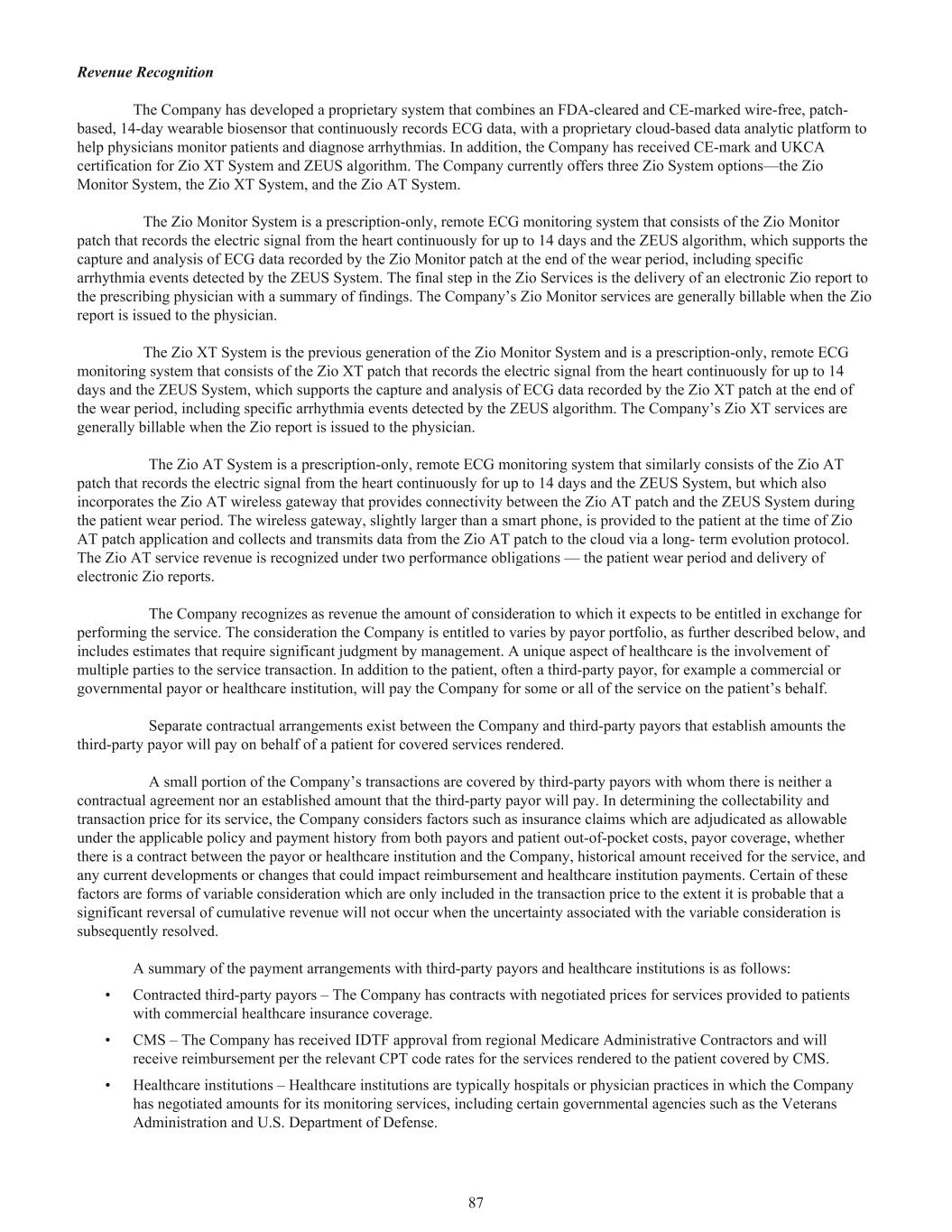 Revenue Recognition The Company has developed a proprietary system that combines an FDA-cleared and CE-marked wire-free, patch- based, 14-day wearable biosensor that continuously records ECG data, with a proprietary cloud-based data analytic platform to help physicians monitor patients and diagnose arrhythmias. In addition, the Company has received CE-mark and UKCA certification for Zio XT System and ZEUS algorithm. The Company currently offers three Zio System options—the Zio Monitor System, the Zio XT System, and the Zio AT System. The Zio Monitor System is a prescription-only, remote ECG monitoring system that consists of the Zio Monitor patch that records the electric signal from the heart continuously for up to 14 days and the ZEUS algorithm, which supports the capture and analysis of ECG data recorded by the Zio Monitor patch at the end of the wear period, including specific arrhythmia events detected by the ZEUS System. The final step in the Zio Services is the delivery of an electronic Zio report to the prescribing physician with a summary of findings. The Company’s Zio Monitor services are generally billable when the Zio report is issued to the physician. The Zio XT System is the previous generation of the Zio Monitor System and is a prescription-only, remote ECG monitoring system that consists of the Zio XT patch that records the electric signal from the heart continuously for up to 14 days and the ZEUS System, which supports the capture and analysis of ECG data recorded by the Zio XT patch at the end of the wear period, including specific arrhythmia events detected by the ZEUS algorithm. The Company’s Zio XT services are generally billable when the Zio report is issued to the physician. The Zio AT System is a prescription-only, remote ECG monitoring system that similarly consists of the Zio AT patch that records the electric signal from the heart continuously for up to 14 days and the ZEUS System, but which also incorporates the Zio AT wireless gateway that provides connectivity between the Zio AT patch and the ZEUS System during the patient wear period. The wireless gateway, slightly larger than a smart phone, is provided to the patient at the time of Zio AT patch application and collects and transmits data from the Zio AT patch to the cloud via a long- term evolution protocol. The Zio AT service revenue is recognized under two performance obligations — the patient wear period and delivery of electronic Zio reports. The Company recognizes as revenue the amount of consideration to which it expects to be entitled in exchange for performing the service. The consideration the Company is entitled to varies by payor portfolio, as further described below, and includes estimates that require significant judgment by management. A unique aspect of healthcare is the involvement of multiple parties to the service transaction. In addition to the patient, often a third-party payor, for example a commercial or governmental payor or healthcare institution, will pay the Company for some or all of the service on the patient’s behalf. Separate contractual arrangements exist between the Company and third-party payors that establish amounts the third-party payor will pay on behalf of a patient for covered services rendered. A small portion of the Company’s transactions are covered by third-party payors with whom there is neither a contractual agreement nor an established amount that the third-party payor will pay. In determining the collectability and transaction price for its service, the Company considers factors such as insurance claims which are adjudicated as allowable under the applicable policy and payment history from both payors and patient out-of-pocket costs, payor coverage, whether there is a contract between the payor or healthcare institution and the Company, historical amount received for the service, and any current developments or changes that could impact reimbursement and healthcare institution payments. Certain of these factors are forms of variable consideration which are only included in the transaction price to the extent it is probable that a significant reversal of cumulative revenue will not occur when the uncertainty associated with the variable consideration is subsequently resolved. A summary of the payment arrangements with third-party payors and healthcare institutions is as follows: • Contracted third-party payors – The Company has contracts with negotiated prices for services provided to patients with commercial healthcare insurance coverage. • CMS – The Company has received IDTF approval from regional Medicare Administrative Contractors and will receive reimbursement per the relevant CPT code rates for the services rendered to the patient covered by CMS. • Healthcare institutions – Healthcare institutions are typically hospitals or physician practices in which the Company has negotiated amounts for its monitoring services, including certain governmental agencies such as the Veterans Administration and U.S. Department of Defense. 87