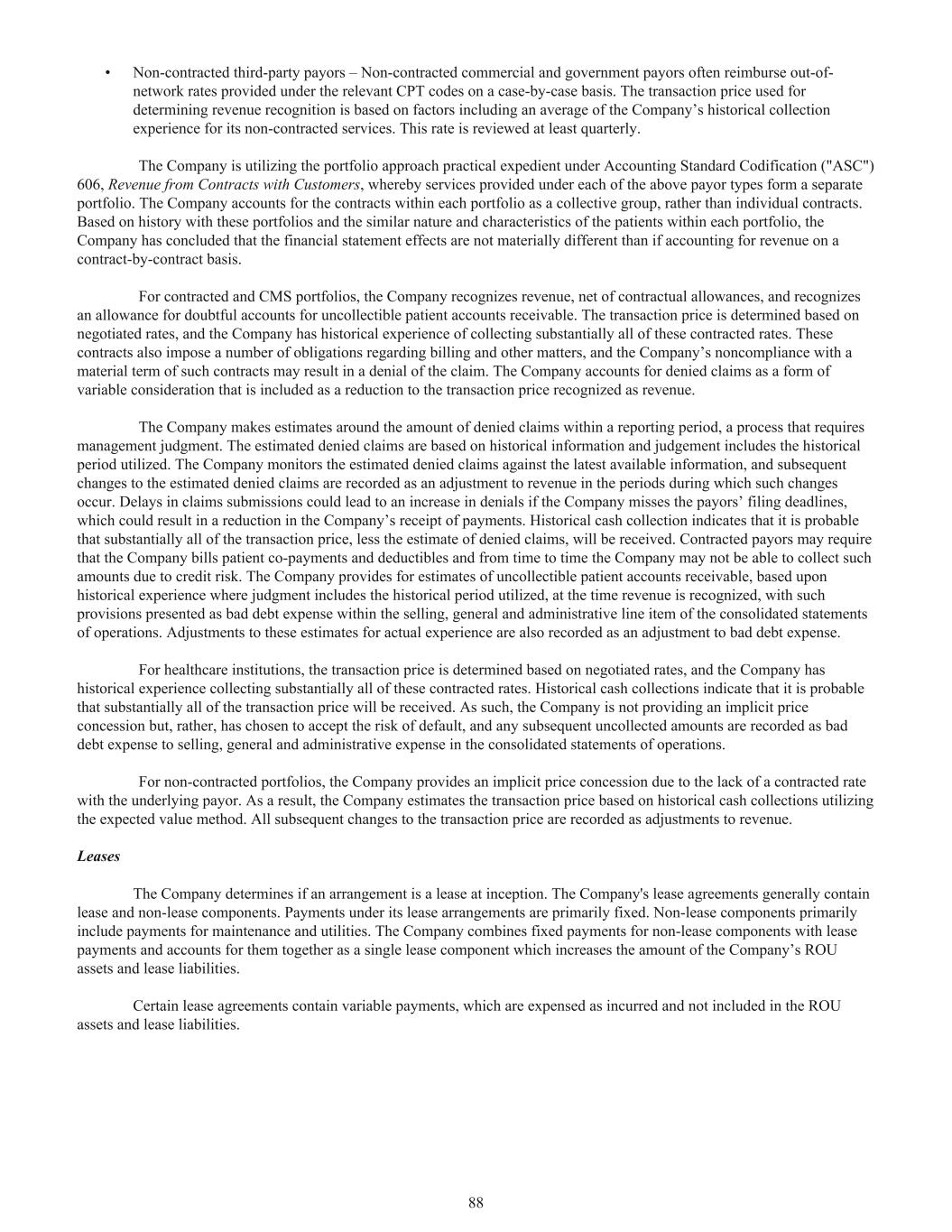 • Non-contracted third-party payors – Non-contracted commercial and government payors often reimburse out-of- network rates provided under the relevant CPT codes on a case-by-case basis. The transaction price used for determining revenue recognition is based on factors including an average of the Company’s historical collection experience for its non-contracted services. This rate is reviewed at least quarterly. The Company is utilizing the portfolio approach practical expedient under Accounting Standard Codification ("ASC") 606, Revenue from Contracts with Customers, whereby services provided under each of the above payor types form a separate portfolio. The Company accounts for the contracts within each portfolio as a collective group, rather than individual contracts. Based on history with these portfolios and the similar nature and characteristics of the patients within each portfolio, the Company has concluded that the financial statement effects are not materially different than if accounting for revenue on a contract-by-contract basis. For contracted and CMS portfolios, the Company recognizes revenue, net of contractual allowances, and recognizes an allowance for doubtful accounts for uncollectible patient accounts receivable. The transaction price is determined based on negotiated rates, and the Company has historical experience of collecting substantially all of these contracted rates. These contracts also impose a number of obligations regarding billing and other matters, and the Company’s noncompliance with a material term of such contracts may result in a denial of the claim. The Company accounts for denied claims as a form of variable consideration that is included as a reduction to the transaction price recognized as revenue. The Company makes estimates around the amount of denied claims within a reporting period, a process that requires management judgment. The estimated denied claims are based on historical information and judgement includes the historical period utilized. The Company monitors the estimated denied claims against the latest available information, and subsequent changes to the estimated denied claims are recorded as an adjustment to revenue in the periods during which such changes occur. Delays in claims submissions could lead to an increase in denials if the Company misses the payors’ filing deadlines, which could result in a reduction in the Company’s receipt of payments. Historical cash collection indicates that it is probable that substantially all of the transaction price, less the estimate of denied claims, will be received. Contracted payors may require that the Company bills patient co-payments and deductibles and from time to time the Company may not be able to collect such amounts due to credit risk. The Company provides for estimates of uncollectible patient accounts receivable, based upon historical experience where judgment includes the historical period utilized, at the time revenue is recognized, with such provisions presented as bad debt expense within the selling, general and administrative line item of the consolidated statements of operations. Adjustments to these estimates for actual experience are also recorded as an adjustment to bad debt expense. For healthcare institutions, the transaction price is determined based on negotiated rates, and the Company has historical experience collecting substantially all of these contracted rates. Historical cash collections indicate that it is probable that substantially all of the transaction price will be received. As such, the Company is not providing an implicit price concession but, rather, has chosen to accept the risk of default, and any subsequent uncollected amounts are recorded as bad debt expense to selling, general and administrative expense in the consolidated statements of operations. For non-contracted portfolios, the Company provides an implicit price concession due to the lack of a contracted rate with the underlying payor. As a result, the Company estimates the transaction price based on historical cash collections utilizing the expected value method. All subsequent changes to the transaction price are recorded as adjustments to revenue. Leases The Company determines if an arrangement is a lease at inception. The Company's lease agreements generally contain lease and non-lease components. Payments under its lease arrangements are primarily fixed. Non-lease components primarily include payments for maintenance and utilities. The Company combines fixed payments for non-lease components with lease payments and accounts for them together as a single lease component which increases the amount of the Company’s ROU assets and lease liabilities. Certain lease agreements contain variable payments, which are expensed as incurred and not included in the ROU assets and lease liabilities. 88