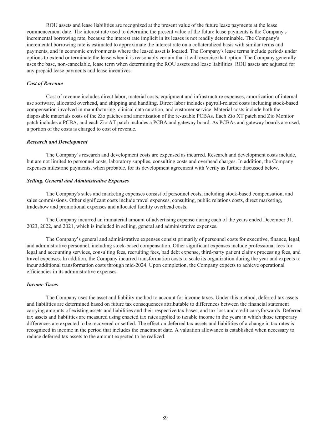 ROU assets and lease liabilities are recognized at the present value of the future lease payments at the lease commencement date. The interest rate used to determine the present value of the future lease payments is the Company's incremental borrowing rate, because the interest rate implicit in its leases is not readily determinable. The Company's incremental borrowing rate is estimated to approximate the interest rate on a collateralized basis with similar terms and payments, and in economic environments where the leased asset is located. The Company's lease terms include periods under options to extend or terminate the lease when it is reasonably certain that it will exercise that option. The Company generally uses the base, non-cancelable, lease term when determining the ROU assets and lease liabilities. ROU assets are adjusted for any prepaid lease payments and lease incentives. Cost of Revenue Cost of revenue includes direct labor, material costs, equipment and infrastructure expenses, amortization of internal use software, allocated overhead, and shipping and handling. Direct labor includes payroll-related costs including stock-based compensation involved in manufacturing, clinical data curation, and customer service. Material costs include both the disposable materials costs of the Zio patches and amortization of the re-usable PCBAs. Each Zio XT patch and Zio Monitor patch includes a PCBA, and each Zio AT patch includes a PCBA and gateway board. As PCBAs and gateway boards are used, a portion of the costs is charged to cost of revenue. Research and Development The Company’s research and development costs are expensed as incurred. Research and development costs include, but are not limited to personnel costs, laboratory supplies, consulting costs and overhead charges. In addition, the Company expenses milestone payments, when probable, for its development agreement with Verily as further discussed below. Selling, General and Administrative Expenses The Company's sales and marketing expenses consist of personnel costs, including stock-based compensation, and sales commissions. Other significant costs include travel expenses, consulting, public relations costs, direct marketing, tradeshow and promotional expenses and allocated facility overhead costs. The Company incurred an immaterial amount of advertising expense during each of the years ended December 31, 2023, 2022, and 2021, which is included in selling, general and administrative expenses. The Company’s general and administrative expenses consist primarily of personnel costs for executive, finance, legal, and administrative personnel, including stock-based compensation. Other significant expenses include professional fees for legal and accounting services, consulting fees, recruiting fees, bad debt expense, third-party patient claims processing fees, and travel expenses. In addition, the Company incurred transformation costs to scale its organization during the year and expects to incur additional transformation costs through mid-2024. Upon completion, the Company expects to achieve operational efficiencies in its administrative expenses. Income Taxes The Company uses the asset and liability method to account for income taxes. Under this method, deferred tax assets and liabilities are determined based on future tax consequences attributable to differences between the financial statement carrying amounts of existing assets and liabilities and their respective tax bases, and tax loss and credit carryforwards. Deferred tax assets and liabilities are measured using enacted tax rates applied to taxable income in the years in which those temporary differences are expected to be recovered or settled. The effect on deferred tax assets and liabilities of a change in tax rates is recognized in income in the period that includes the enactment date. A valuation allowance is established when necessary to reduce deferred tax assets to the amount expected to be realized. 89
