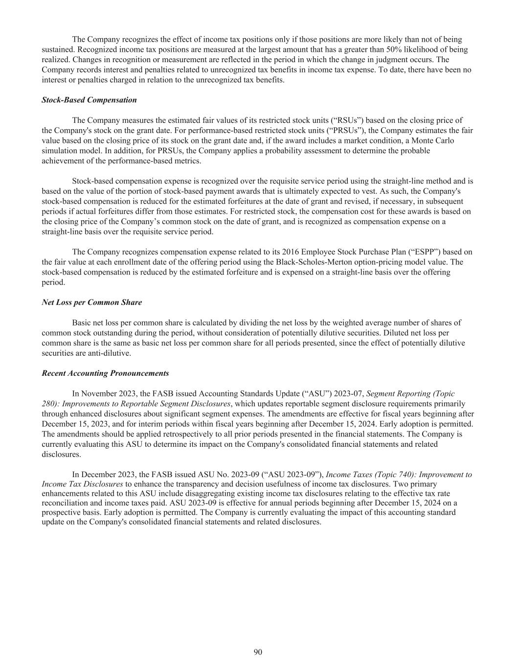 The Company recognizes the effect of income tax positions only if those positions are more likely than not of being sustained. Recognized income tax positions are measured at the largest amount that has a greater than 50% likelihood of being realized. Changes in recognition or measurement are reflected in the period in which the change in judgment occurs. The Company records interest and penalties related to unrecognized tax benefits in income tax expense. To date, there have been no interest or penalties charged in relation to the unrecognized tax benefits. Stock-Based Compensation The Company measures the estimated fair values of its restricted stock units (“RSUs”) based on the closing price of the Company's stock on the grant date. For performance-based restricted stock units (“PRSUs”), the Company estimates the fair value based on the closing price of its stock on the grant date and, if the award includes a market condition, a Monte Carlo simulation model. In addition, for PRSUs, the Company applies a probability assessment to determine the probable achievement of the performance-based metrics. Stock-based compensation expense is recognized over the requisite service period using the straight-line method and is based on the value of the portion of stock-based payment awards that is ultimately expected to vest. As such, the Company's stock-based compensation is reduced for the estimated forfeitures at the date of grant and revised, if necessary, in subsequent periods if actual forfeitures differ from those estimates. For restricted stock, the compensation cost for these awards is based on the closing price of the Company’s common stock on the date of grant, and is recognized as compensation expense on a straight-line basis over the requisite service period. The Company recognizes compensation expense related to its 2016 Employee Stock Purchase Plan (“ESPP”) based on the fair value at each enrollment date of the offering period using the Black-Scholes-Merton option-pricing model value. The stock-based compensation is reduced by the estimated forfeiture and is expensed on a straight-line basis over the offering period. Net Loss per Common Share Basic net loss per common share is calculated by dividing the net loss by the weighted average number of shares of common stock outstanding during the period, without consideration of potentially dilutive securities. Diluted net loss per common share is the same as basic net loss per common share for all periods presented, since the effect of potentially dilutive securities are anti-dilutive. Recent Accounting Pronouncements In November 2023, the FASB issued Accounting Standards Update (“ASU”) 2023-07, Segment Reporting (Topic 280): Improvements to Reportable Segment Disclosures, which updates reportable segment disclosure requirements primarily through enhanced disclosures about significant segment expenses. The amendments are effective for fiscal years beginning after December 15, 2023, and for interim periods within fiscal years beginning after December 15, 2024. Early adoption is permitted. The amendments should be applied retrospectively to all prior periods presented in the financial statements. The Company is currently evaluating this ASU to determine its impact on the Company's consolidated financial statements and related disclosures. In December 2023, the FASB issued ASU No. 2023-09 (“ASU 2023-09”), Income Taxes (Topic 740): Improvement to Income Tax Disclosures to enhance the transparency and decision usefulness of income tax disclosures. Two primary enhancements related to this ASU include disaggregating existing income tax disclosures relating to the effective tax rate reconciliation and income taxes paid. ASU 2023-09 is effective for annual periods beginning after December 15, 2024 on a prospective basis. Early adoption is permitted. The Company is currently evaluating the impact of this accounting standard update on the Company's consolidated financial statements and related disclosures. 90