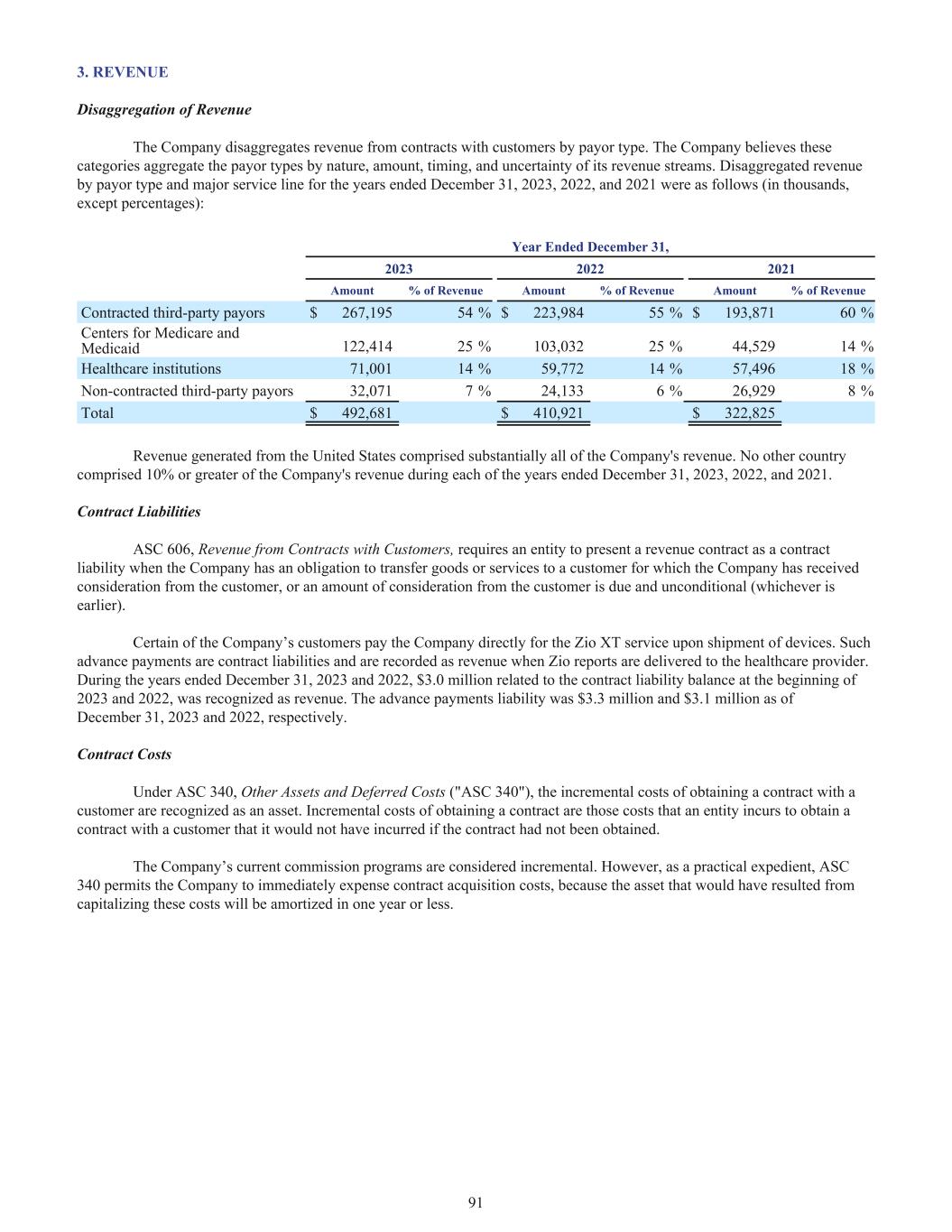 3. REVENUE Disaggregation of Revenue The Company disaggregates revenue from contracts with customers by payor type. The Company believes these categories aggregate the payor types by nature, amount, timing, and uncertainty of its revenue streams. Disaggregated revenue by payor type and major service line for the years ended December 31, 2023, 2022, and 2021 were as follows (in thousands, except percentages): Year Ended December 31, 2023 2022 2021 Amount % of Revenue Amount % of Revenue Amount % of Revenue Contracted third-party payors $ 267,195 54 % $ 223,984 55 % $ 193,871 60 % Centers for Medicare and Medicaid 122,414 25 % 103,032 25 % 44,529 14 % Healthcare institutions 71,001 14 % 59,772 14 % 57,496 18 % Non-contracted third-party payors 32,071 7 % 24,133 6 % 26,929 8 % Total $ 492,681 $ 410,921 $ 322,825 Revenue generated from the United States comprised substantially all of the Company's revenue. No other country comprised 10% or greater of the Company's revenue during each of the years ended December 31, 2023, 2022, and 2021. Contract Liabilities ASC 606, Revenue from Contracts with Customers, requires an entity to present a revenue contract as a contract liability when the Company has an obligation to transfer goods or services to a customer for which the Company has received consideration from the customer, or an amount of consideration from the customer is due and unconditional (whichever is earlier). Certain of the Company’s customers pay the Company directly for the Zio XT service upon shipment of devices. Such advance payments are contract liabilities and are recorded as revenue when Zio reports are delivered to the healthcare provider. During the years ended December 31, 2023 and 2022, $3.0 million related to the contract liability balance at the beginning of 2023 and 2022, was recognized as revenue. The advance payments liability was $3.3 million and $3.1 million as of December 31, 2023 and 2022, respectively. Contract Costs Under ASC 340, Other Assets and Deferred Costs ("ASC 340"), the incremental costs of obtaining a contract with a customer are recognized as an asset. Incremental costs of obtaining a contract are those costs that an entity incurs to obtain a contract with a customer that it would not have incurred if the contract had not been obtained. The Company’s current commission programs are considered incremental. However, as a practical expedient, ASC 340 permits the Company to immediately expense contract acquisition costs, because the asset that would have resulted from capitalizing these costs will be amortized in one year or less. 91