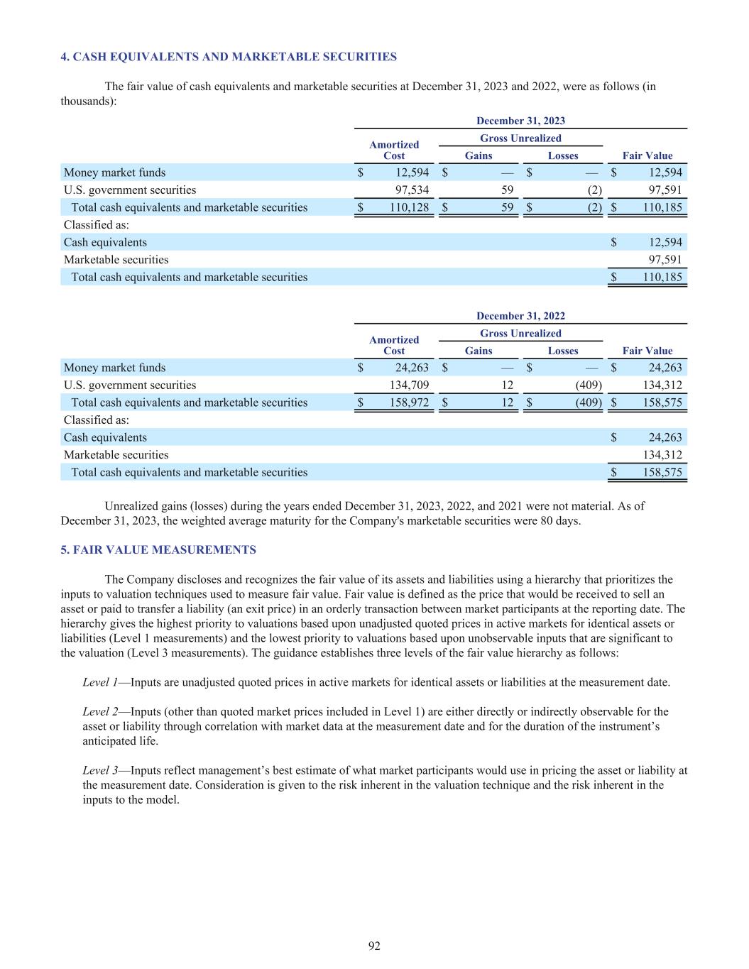 4. CASH EQUIVALENTS AND MARKETABLE SECURITIES The fair value of cash equivalents and marketable securities at December 31, 2023 and 2022, were as follows (in thousands): December 31, 2023 Amortized Cost Gross Unrealized Fair ValueGains Losses Money market funds $ 12,594 $ — $ — $ 12,594 U.S. government securities 97,534 59 (2) 97,591 Total cash equivalents and marketable securities $ 110,128 $ 59 $ (2) $ 110,185 Classified as: Cash equivalents $ 12,594 Marketable securities 97,591 Total cash equivalents and marketable securities $ 110,185 December 31, 2022 Amortized Cost Gross Unrealized Fair ValueGains Losses Money market funds $ 24,263 $ — $ — $ 24,263 U.S. government securities 134,709 12 (409) 134,312 Total cash equivalents and marketable securities $ 158,972 $ 12 $ (409) $ 158,575 Classified as: Cash equivalents $ 24,263 Marketable securities 134,312 Total cash equivalents and marketable securities $ 158,575 Unrealized gains (losses) during the years ended December 31, 2023, 2022, and 2021 were not material. As of December 31, 2023, the weighted average maturity for the Company's marketable securities were 80 days. 5. FAIR VALUE MEASUREMENTS The Company discloses and recognizes the fair value of its assets and liabilities using a hierarchy that prioritizes the inputs to valuation techniques used to measure fair value. Fair value is defined as the price that would be received to sell an asset or paid to transfer a liability (an exit price) in an orderly transaction between market participants at the reporting date. The hierarchy gives the highest priority to valuations based upon unadjusted quoted prices in active markets for identical assets or liabilities (Level 1 measurements) and the lowest priority to valuations based upon unobservable inputs that are significant to the valuation (Level 3 measurements). The guidance establishes three levels of the fair value hierarchy as follows: Level 1—Inputs are unadjusted quoted prices in active markets for identical assets or liabilities at the measurement date. Level 2—Inputs (other than quoted market prices included in Level 1) are either directly or indirectly observable for the asset or liability through correlation with market data at the measurement date and for the duration of the instrument’s anticipated life. Level 3—Inputs reflect management’s best estimate of what market participants would use in pricing the asset or liability at the measurement date. Consideration is given to the risk inherent in the valuation technique and the risk inherent in the inputs to the model. 92
