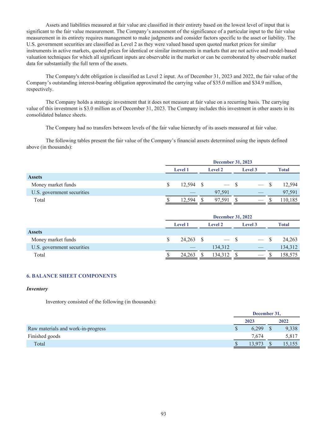 Assets and liabilities measured at fair value are classified in their entirety based on the lowest level of input that is significant to the fair value measurement. The Company’s assessment of the significance of a particular input to the fair value measurement in its entirety requires management to make judgments and consider factors specific to the asset or liability. The U.S. government securities are classified as Level 2 as they were valued based upon quoted market prices for similar instruments in active markets, quoted prices for identical or similar instruments in markets that are not active and model-based valuation techniques for which all significant inputs are observable in the market or can be corroborated by observable market data for substantially the full term of the assets. The Company's debt obligation is classified as Level 2 input. As of December 31, 2023 and 2022, the fair value of the Company’s outstanding interest-bearing obligation approximated the carrying value of $35.0 million and $34.9 million, respectively. The Company holds a strategic investment that it does not measure at fair value on a recurring basis. The carrying value of this investment is $3.0 million as of December 31, 2023. The Company includes this investment in other assets in its consolidated balance sheets. The Company had no transfers between levels of the fair value hierarchy of its assets measured at fair value. The following tables present the fair value of the Company’s financial assets determined using the inputs defined above (in thousands): December 31, 2023 Level 1 Level 2 Level 3 Total Assets Money market funds $ 12,594 $ — $ — $ 12,594 U.S. government securities — 97,591 — 97,591 Total $ 12,594 $ 97,591 $ — $ 110,185 December 31, 2022 Level 1 Level 2 Level 3 Total Assets Money market funds $ 24,263 $ — $ — $ 24,263 U.S. government securities — 134,312 — 134,312 Total $ 24,263 $ 134,312 $ — $ 158,575 6. BALANCE SHEET COMPONENTS Inventory Inventory consisted of the following (in thousands): December 31, 2023 2022 Raw materials and work-in-progress $ 6,299 $ 9,338 Finished goods 7,674 5,817 Total $ 13,973 $ 15,155 93