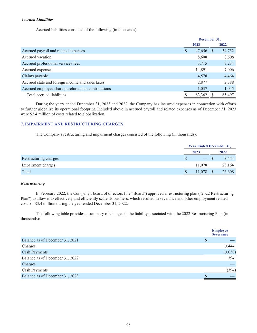 Accrued Liabilities Accrued liabilities consisted of the following (in thousands): December 31, 2023 2022 Accrued payroll and related expenses $ 47,656 $ 34,752 Accrued vacation 8,608 8,608 Accrued professional services fees 3,715 7,234 Accrued expenses 14,891 7,006 Claims payable 4,578 4,464 Accrued state and foreign income and sales taxes 2,877 2,388 Accrued employee share purchase plan contributions 1,037 1,045 Total accrued liabilities $ 83,362 $ 65,497 During the years ended December 31, 2023 and 2022, the Company has incurred expenses in connection with efforts to further globalize its operational footprint. Included above in accrued payroll and related expenses as of December 31, 2023 were $2.4 million of costs related to globalization. 7. IMPAIRMENT AND RESTRUCTURING CHARGES The Company's restructuring and impairment charges consisted of the following (in thousands): Year Ended December 31, 2023 2022 Restructuring charges $ — $ 3,444 Impairment charges 11,078 23,164 Total $ 11,078 $ 26,608 Restructuring In February 2022, the Company's board of directors (the “Board”) approved a restructuring plan ("2022 Restructuring Plan") to allow it to effectively and efficiently scale its business, which resulted in severance and other employment related costs of $3.4 million during the year ended December 31, 2022. The following table provides a summary of changes in the liability associated with the 2022 Restructuring Plan (in thousands): Employee Severance Balance as of December 31, 2021 $ — Charges 3,444 Cash Payments (3,050) Balance as of December 31, 2022 394 Charges — Cash Payments (394) Balance as of December 31, 2023 $ — 95