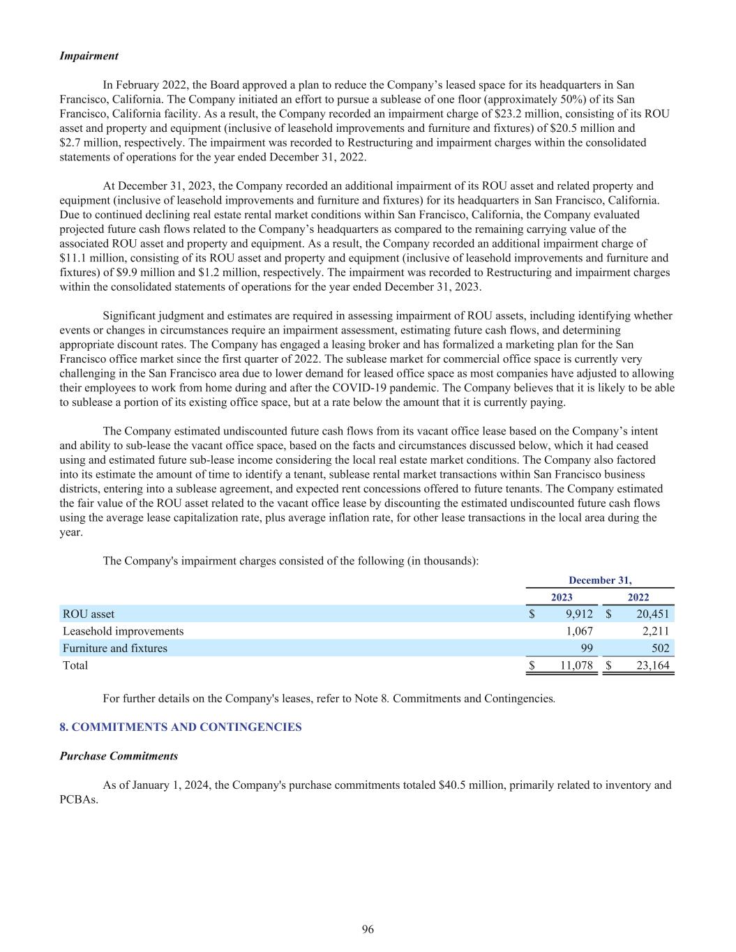 Impairment In February 2022, the Board approved a plan to reduce the Company’s leased space for its headquarters in San Francisco, California. The Company initiated an effort to pursue a sublease of one floor (approximately 50%) of its San Francisco, California facility. As a result, the Company recorded an impairment charge of $23.2 million, consisting of its ROU asset and property and equipment (inclusive of leasehold improvements and furniture and fixtures) of $20.5 million and $2.7 million, respectively. The impairment was recorded to Restructuring and impairment charges within the consolidated statements of operations for the year ended December 31, 2022. At December 31, 2023, the Company recorded an additional impairment of its ROU asset and related property and equipment (inclusive of leasehold improvements and furniture and fixtures) for its headquarters in San Francisco, California. Due to continued declining real estate rental market conditions within San Francisco, California, the Company evaluated projected future cash flows related to the Company’s headquarters as compared to the remaining carrying value of the associated ROU asset and property and equipment. As a result, the Company recorded an additional impairment charge of $11.1 million, consisting of its ROU asset and property and equipment (inclusive of leasehold improvements and furniture and fixtures) of $9.9 million and $1.2 million, respectively. The impairment was recorded to Restructuring and impairment charges within the consolidated statements of operations for the year ended December 31, 2023. Significant judgment and estimates are required in assessing impairment of ROU assets, including identifying whether events or changes in circumstances require an impairment assessment, estimating future cash flows, and determining appropriate discount rates. The Company has engaged a leasing broker and has formalized a marketing plan for the San Francisco office market since the first quarter of 2022. The sublease market for commercial office space is currently very challenging in the San Francisco area due to lower demand for leased office space as most companies have adjusted to allowing their employees to work from home during and after the COVID-19 pandemic. The Company believes that it is likely to be able to sublease a portion of its existing office space, but at a rate below the amount that it is currently paying. The Company estimated undiscounted future cash flows from its vacant office lease based on the Company’s intent and ability to sub-lease the vacant office space, based on the facts and circumstances discussed below, which it had ceased using and estimated future sub-lease income considering the local real estate market conditions. The Company also factored into its estimate the amount of time to identify a tenant, sublease rental market transactions within San Francisco business districts, entering into a sublease agreement, and expected rent concessions offered to future tenants. The Company estimated the fair value of the ROU asset related to the vacant office lease by discounting the estimated undiscounted future cash flows using the average lease capitalization rate, plus average inflation rate, for other lease transactions in the local area during the year. The Company's impairment charges consisted of the following (in thousands): December 31, 2023 2022 ROU asset $ 9,912 $ 20,451 Leasehold improvements 1,067 2,211 Furniture and fixtures 99 502 Total $ 11,078 $ 23,164 For further details on the Company's leases, refer to Note 8. Commitments and Contingencies. 8. COMMITMENTS AND CONTINGENCIES Purchase Commitments As of January 1, 2024, the Company's purchase commitments totaled $40.5 million, primarily related to inventory and PCBAs. 96