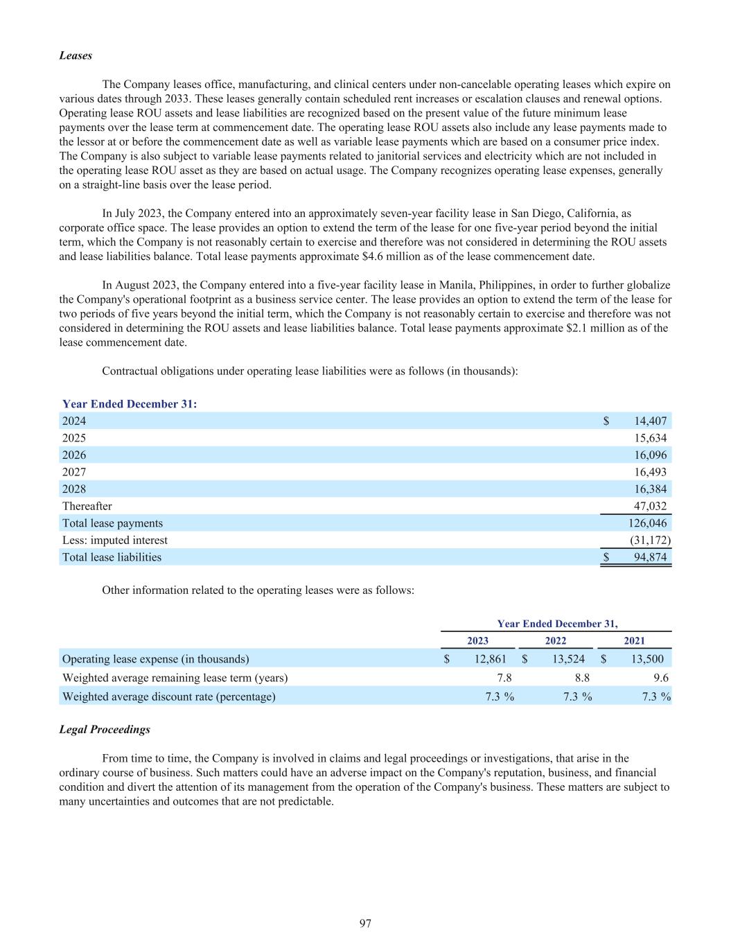 Leases The Company leases office, manufacturing, and clinical centers under non-cancelable operating leases which expire on various dates through 2033. These leases generally contain scheduled rent increases or escalation clauses and renewal options. Operating lease ROU assets and lease liabilities are recognized based on the present value of the future minimum lease payments over the lease term at commencement date. The operating lease ROU assets also include any lease payments made to the lessor at or before the commencement date as well as variable lease payments which are based on a consumer price index. The Company is also subject to variable lease payments related to janitorial services and electricity which are not included in the operating lease ROU asset as they are based on actual usage. The Company recognizes operating lease expenses, generally on a straight-line basis over the lease period. In July 2023, the Company entered into an approximately seven-year facility lease in San Diego, California, as corporate office space. The lease provides an option to extend the term of the lease for one five-year period beyond the initial term, which the Company is not reasonably certain to exercise and therefore was not considered in determining the ROU assets and lease liabilities balance. Total lease payments approximate $4.6 million as of the lease commencement date. In August 2023, the Company entered into a five-year facility lease in Manila, Philippines, in order to further globalize the Company's operational footprint as a business service center. The lease provides an option to extend the term of the lease for two periods of five years beyond the initial term, which the Company is not reasonably certain to exercise and therefore was not considered in determining the ROU assets and lease liabilities balance. Total lease payments approximate $2.1 million as of the lease commencement date. Contractual obligations under operating lease liabilities were as follows (in thousands): Year Ended December 31: 2024 $ 14,407 2025 15,634 2026 16,096 2027 16,493 2028 16,384 Thereafter 47,032 Total lease payments 126,046 Less: imputed interest (31,172) Total lease liabilities $ 94,874 Other information related to the operating leases were as follows: Year Ended December 31, 2023 2022 2021 Operating lease expense (in thousands) $ 12,861 $ 13,524 $ 13,500 Weighted average remaining lease term (years) 7.8 8.8 9.6 Weighted average discount rate (percentage) 7.3 % 7.3 % 7.3 % Legal Proceedings From time to time, the Company is involved in claims and legal proceedings or investigations, that arise in the ordinary course of business. Such matters could have an adverse impact on the Company's reputation, business, and financial condition and divert the attention of its management from the operation of the Company's business. These matters are subject to many uncertainties and outcomes that are not predictable. 97