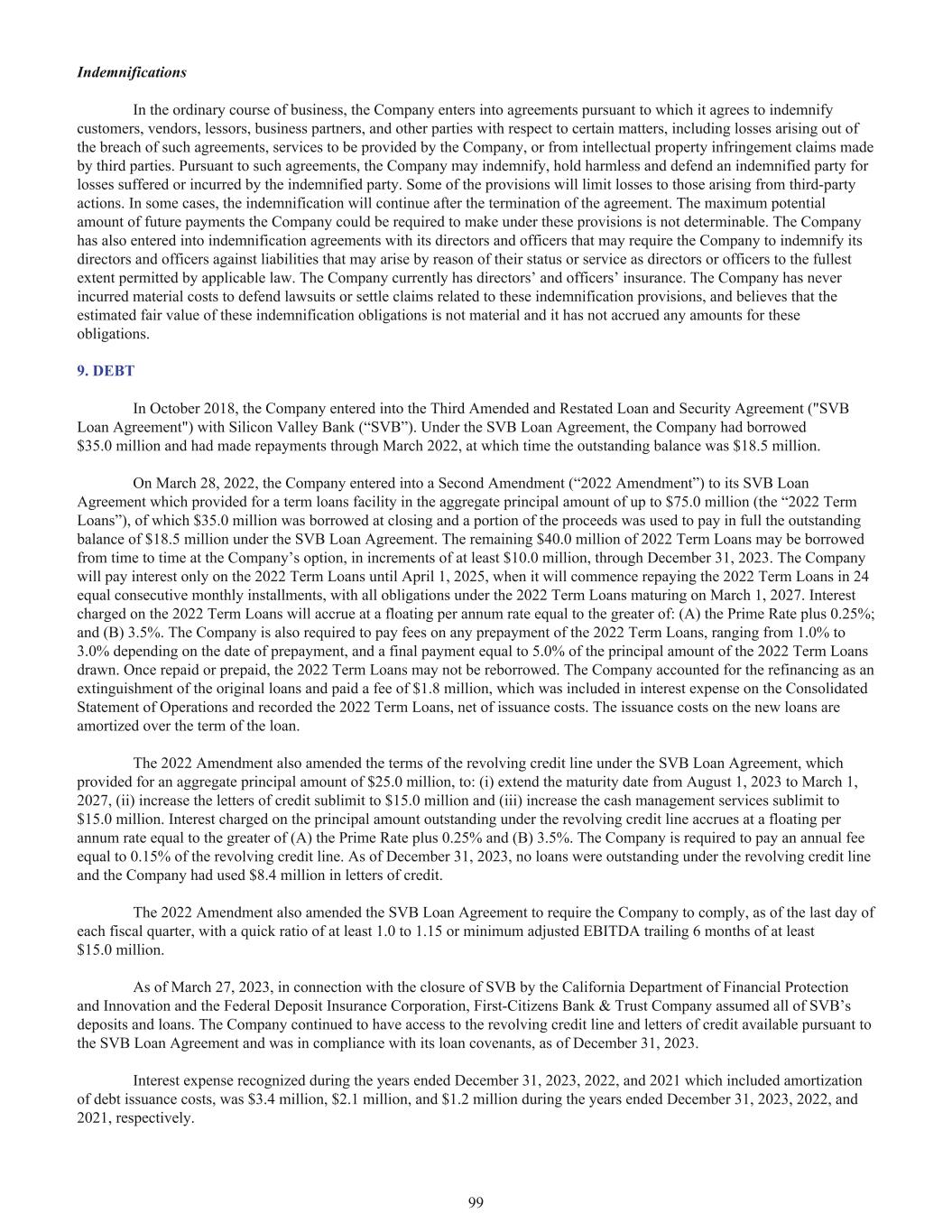 Indemnifications In the ordinary course of business, the Company enters into agreements pursuant to which it agrees to indemnify customers, vendors, lessors, business partners, and other parties with respect to certain matters, including losses arising out of the breach of such agreements, services to be provided by the Company, or from intellectual property infringement claims made by third parties. Pursuant to such agreements, the Company may indemnify, hold harmless and defend an indemnified party for losses suffered or incurred by the indemnified party. Some of the provisions will limit losses to those arising from third-party actions. In some cases, the indemnification will continue after the termination of the agreement. The maximum potential amount of future payments the Company could be required to make under these provisions is not determinable. The Company has also entered into indemnification agreements with its directors and officers that may require the Company to indemnify its directors and officers against liabilities that may arise by reason of their status or service as directors or officers to the fullest extent permitted by applicable law. The Company currently has directors’ and officers’ insurance. The Company has never incurred material costs to defend lawsuits or settle claims related to these indemnification provisions, and believes that the estimated fair value of these indemnification obligations is not material and it has not accrued any amounts for these obligations. 9. DEBT In October 2018, the Company entered into the Third Amended and Restated Loan and Security Agreement ("SVB Loan Agreement") with Silicon Valley Bank (“SVB”). Under the SVB Loan Agreement, the Company had borrowed $35.0 million and had made repayments through March 2022, at which time the outstanding balance was $18.5 million. On March 28, 2022, the Company entered into a Second Amendment (“2022 Amendment”) to its SVB Loan Agreement which provided for a term loans facility in the aggregate principal amount of up to $75.0 million (the “2022 Term Loans”), of which $35.0 million was borrowed at closing and a portion of the proceeds was used to pay in full the outstanding balance of $18.5 million under the SVB Loan Agreement. The remaining $40.0 million of 2022 Term Loans may be borrowed from time to time at the Company’s option, in increments of at least $10.0 million, through December 31, 2023. The Company will pay interest only on the 2022 Term Loans until April 1, 2025, when it will commence repaying the 2022 Term Loans in 24 equal consecutive monthly installments, with all obligations under the 2022 Term Loans maturing on March 1, 2027. Interest charged on the 2022 Term Loans will accrue at a floating per annum rate equal to the greater of: (A) the Prime Rate plus 0.25%; and (B) 3.5%. The Company is also required to pay fees on any prepayment of the 2022 Term Loans, ranging from 1.0% to 3.0% depending on the date of prepayment, and a final payment equal to 5.0% of the principal amount of the 2022 Term Loans drawn. Once repaid or prepaid, the 2022 Term Loans may not be reborrowed. The Company accounted for the refinancing as an extinguishment of the original loans and paid a fee of $1.8 million, which was included in interest expense on the Consolidated Statement of Operations and recorded the 2022 Term Loans, net of issuance costs. The issuance costs on the new loans are amortized over the term of the loan. The 2022 Amendment also amended the terms of the revolving credit line under the SVB Loan Agreement, which provided for an aggregate principal amount of $25.0 million, to: (i) extend the maturity date from August 1, 2023 to March 1, 2027, (ii) increase the letters of credit sublimit to $15.0 million and (iii) increase the cash management services sublimit to $15.0 million. Interest charged on the principal amount outstanding under the revolving credit line accrues at a floating per annum rate equal to the greater of (A) the Prime Rate plus 0.25% and (B) 3.5%. The Company is required to pay an annual fee equal to 0.15% of the revolving credit line. As of December 31, 2023, no loans were outstanding under the revolving credit line and the Company had used $8.4 million in letters of credit. The 2022 Amendment also amended the SVB Loan Agreement to require the Company to comply, as of the last day of each fiscal quarter, with a quick ratio of at least 1.0 to 1.15 or minimum adjusted EBITDA trailing 6 months of at least $15.0 million. As of March 27, 2023, in connection with the closure of SVB by the California Department of Financial Protection and Innovation and the Federal Deposit Insurance Corporation, First-Citizens Bank & Trust Company assumed all of SVB’s deposits and loans. The Company continued to have access to the revolving credit line and letters of credit available pursuant to the SVB Loan Agreement and was in compliance with its loan covenants, as of December 31, 2023. Interest expense recognized during the years ended December 31, 2023, 2022, and 2021 which included amortization of debt issuance costs, was $3.4 million, $2.1 million, and $1.2 million during the years ended December 31, 2023, 2022, and 2021, respectively. 99