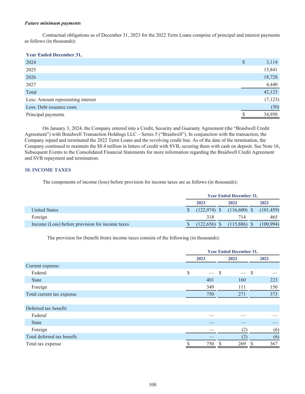 Future minimum payments Contractual obligations as of December 31, 2023 for the 2022 Term Loans comprise of principal and interest payments as follows (in thousands): Year Ended December 31, 2024 $ 3,114 2025 15,841 2026 18,728 2027 4,440 Total 42,123 Less: Amount representing interest (7,123) Less: Debt issuance costs (50) Principal payments $ 34,950 On January 3, 2024, the Company entered into a Credit, Security and Guaranty Agreement (the “Braidwell Credit Agreement”) with Braidwell Transaction Holdings LLC – Series 5 (“Braidwell”). In conjunction with the transaction, the Company repaid and terminated the 2022 Term Loans and the revolving credit line. As of the date of the termination, the Company continued to maintain the $8.4 million in letters of credit with SVB, securing them with cash on deposit. See Note 16, Subsequent Events to the Consolidated Financial Statements for more information regarding the Braidwell Credit Agreement and SVB repayment and termination. 10. INCOME TAXES The components of income (loss) before provision for income taxes are as follows (in thousands): Year Ended December 31, 2023 2022 2021 United States $ (122,974) $ (116,600) $ (101,459) Foreign 318 714 465 Income (Loss) before provision for income taxes $ (122,656) $ (115,886) $ (100,994) The provision for (benefit from) income taxes consists of the following (in thousands): Year Ended December 31, 2023 2022 2021 Current expense: Federal $ — $ — $ — State 401 160 223 Foreign 349 111 150 Total current tax expense 750 271 373 Deferred tax benefit: Federal — — — State — — — Foreign — (2) (6) Total deferred tax benefit — (2) (6) Total tax expense $ 750 $ 269 $ 367 100