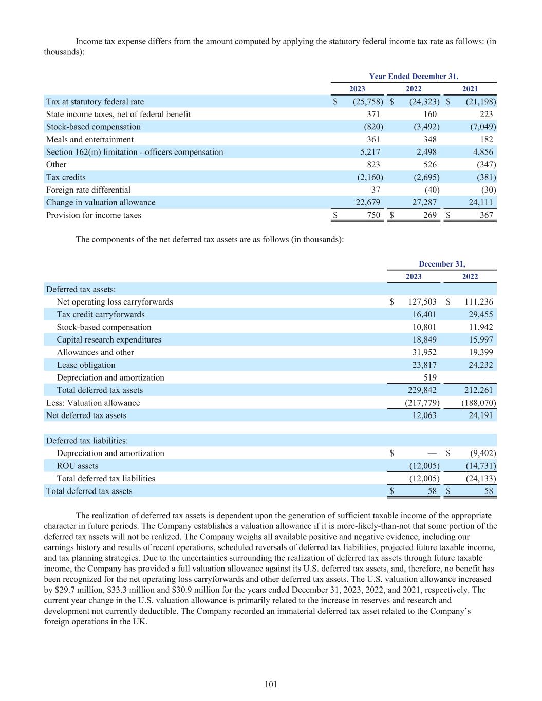 Income tax expense differs from the amount computed by applying the statutory federal income tax rate as follows: (in thousands): Year Ended December 31, 2023 2022 2021 Tax at statutory federal rate $ (25,758) $ (24,323) $ (21,198) State income taxes, net of federal benefit 371 160 223 Stock-based compensation (820) (3,492) (7,049) Meals and entertainment 361 348 182 Section 162(m) limitation - officers compensation 5,217 2,498 4,856 Other 823 526 (347) Tax credits (2,160) (2,695) (381) Foreign rate differential 37 (40) (30) Change in valuation allowance 22,679 27,287 24,111 Provision for income taxes $ 750 $ 269 $ 367 The components of the net deferred tax assets are as follows (in thousands): December 31, 2023 2022 Deferred tax assets: Net operating loss carryforwards $ 127,503 $ 111,236 Tax credit carryforwards 16,401 29,455 Stock-based compensation 10,801 11,942 Capital research expenditures 18,849 15,997 Allowances and other 31,952 19,399 Lease obligation 23,817 24,232 Depreciation and amortization 519 — Total deferred tax assets 229,842 212,261 Less: Valuation allowance (217,779) (188,070) Net deferred tax assets 12,063 24,191 Deferred tax liabilities: Depreciation and amortization $ — $ (9,402) ROU assets (12,005) (14,731) Total deferred tax liabilities (12,005) (24,133) Total deferred tax assets $ 58 $ 58 The realization of deferred tax assets is dependent upon the generation of sufficient taxable income of the appropriate character in future periods. The Company establishes a valuation allowance if it is more-likely-than-not that some portion of the deferred tax assets will not be realized. The Company weighs all available positive and negative evidence, including our earnings history and results of recent operations, scheduled reversals of deferred tax liabilities, projected future taxable income, and tax planning strategies. Due to the uncertainties surrounding the realization of deferred tax assets through future taxable income, the Company has provided a full valuation allowance against its U.S. deferred tax assets, and, therefore, no benefit has been recognized for the net operating loss carryforwards and other deferred tax assets. The U.S. valuation allowance increased by $29.7 million, $33.3 million and $30.9 million for the years ended December 31, 2023, 2022, and 2021, respectively. The current year change in the U.S. valuation allowance is primarily related to the increase in reserves and research and development not currently deductible. The Company recorded an immaterial deferred tax asset related to the Company’s foreign operations in the UK. 101