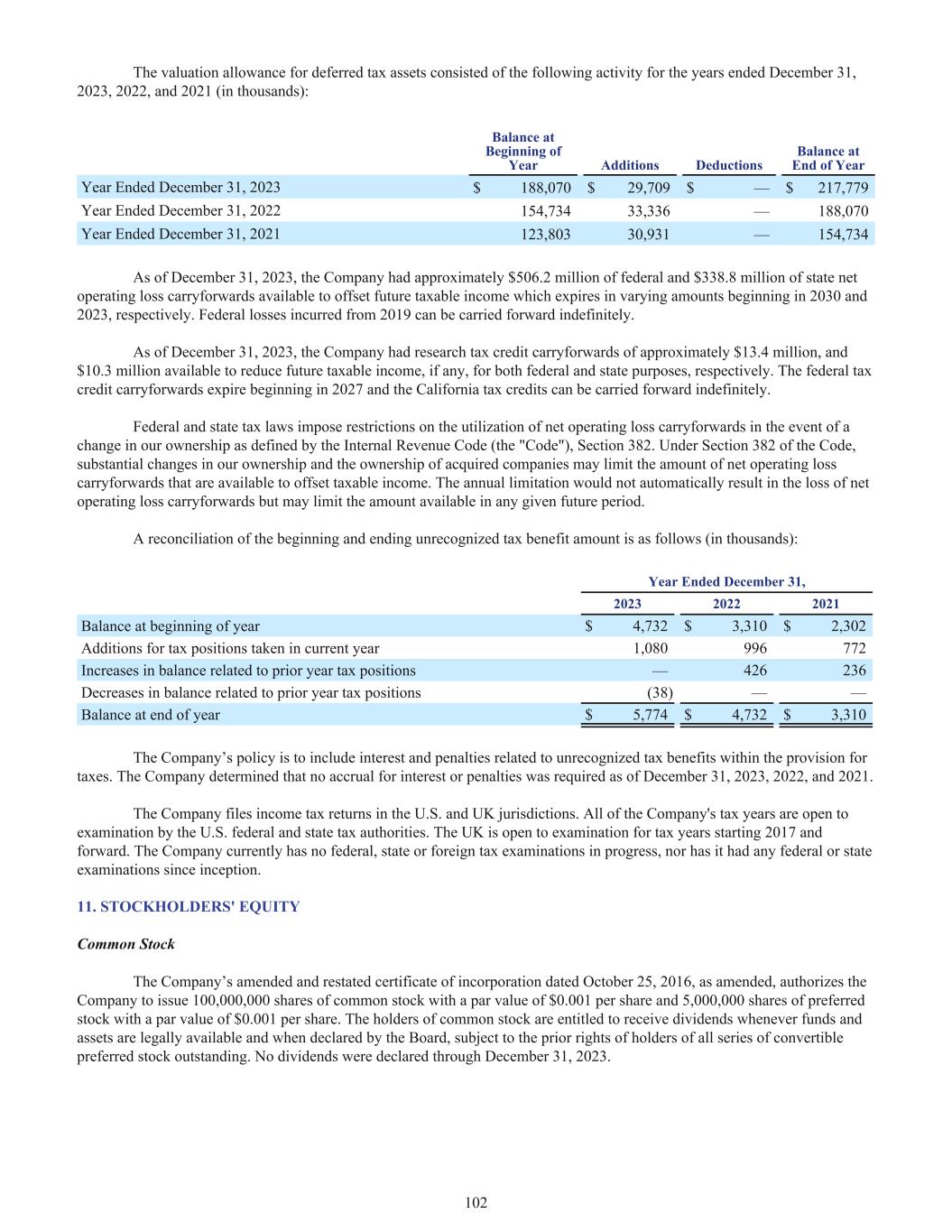 The valuation allowance for deferred tax assets consisted of the following activity for the years ended December 31, 2023, 2022, and 2021 (in thousands): Balance at Beginning of Year Additions Deductions Balance at End of Year Year Ended December 31, 2023 $ 188,070 $ 29,709 $ — $ 217,779 Year Ended December 31, 2022 154,734 33,336 — 188,070 Year Ended December 31, 2021 123,803 30,931 — 154,734 As of December 31, 2023, the Company had approximately $506.2 million of federal and $338.8 million of state net operating loss carryforwards available to offset future taxable income which expires in varying amounts beginning in 2030 and 2023, respectively. Federal losses incurred from 2019 can be carried forward indefinitely. As of December 31, 2023, the Company had research tax credit carryforwards of approximately $13.4 million, and $10.3 million available to reduce future taxable income, if any, for both federal and state purposes, respectively. The federal tax credit carryforwards expire beginning in 2027 and the California tax credits can be carried forward indefinitely. Federal and state tax laws impose restrictions on the utilization of net operating loss carryforwards in the event of a change in our ownership as defined by the Internal Revenue Code (the "Code"), Section 382. Under Section 382 of the Code, substantial changes in our ownership and the ownership of acquired companies may limit the amount of net operating loss carryforwards that are available to offset taxable income. The annual limitation would not automatically result in the loss of net operating loss carryforwards but may limit the amount available in any given future period. A reconciliation of the beginning and ending unrecognized tax benefit amount is as follows (in thousands): Year Ended December 31, 2023 2022 2021 Balance at beginning of year $ 4,732 $ 3,310 $ 2,302 Additions for tax positions taken in current year 1,080 996 772 Increases in balance related to prior year tax positions — 426 236 Decreases in balance related to prior year tax positions (38) — — Balance at end of year $ 5,774 $ 4,732 $ 3,310 The Company’s policy is to include interest and penalties related to unrecognized tax benefits within the provision for taxes. The Company determined that no accrual for interest or penalties was required as of December 31, 2023, 2022, and 2021. The Company files income tax returns in the U.S. and UK jurisdictions. All of the Company's tax years are open to examination by the U.S. federal and state tax authorities. The UK is open to examination for tax years starting 2017 and forward. The Company currently has no federal, state or foreign tax examinations in progress, nor has it had any federal or state examinations since inception. 11. STOCKHOLDERS' EQUITY Common Stock The Company’s amended and restated certificate of incorporation dated October 25, 2016, as amended, authorizes the Company to issue 100,000,000 shares of common stock with a par value of $0.001 per share and 5,000,000 shares of preferred stock with a par value of $0.001 per share. The holders of common stock are entitled to receive dividends whenever funds and assets are legally available and when declared by the Board, subject to the prior rights of holders of all series of convertible preferred stock outstanding. No dividends were declared through December 31, 2023. 102