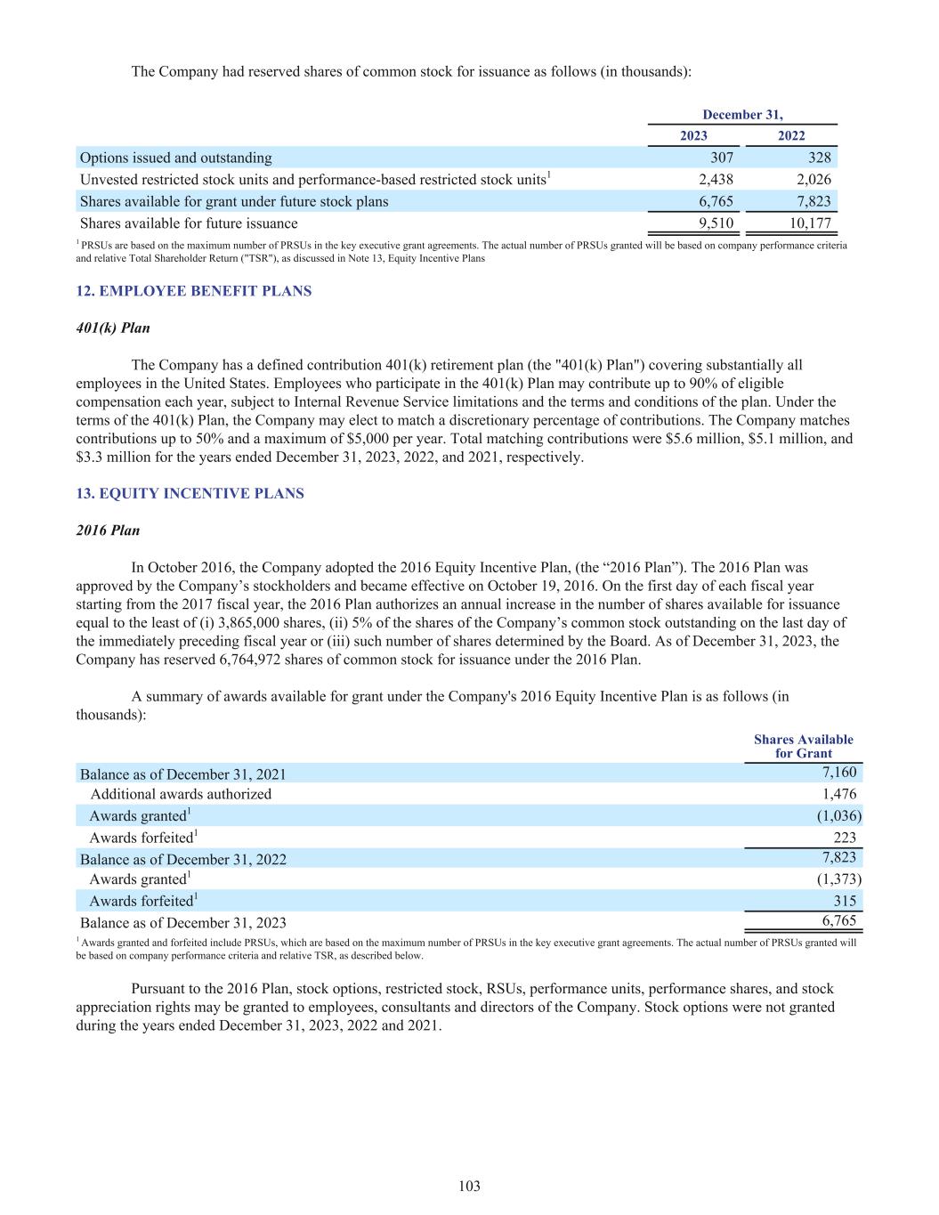 The Company had reserved shares of common stock for issuance as follows (in thousands): December 31, 2023 2022 Options issued and outstanding 307 328 Unvested restricted stock units and performance-based restricted stock units1 2,438 2,026 Shares available for grant under future stock plans 6,765 7,823 Shares available for future issuance 9,510 10,177 1 PRSUs are based on the maximum number of PRSUs in the key executive grant agreements. The actual number of PRSUs granted will be based on company performance criteria and relative Total Shareholder Return ("TSR"), as discussed in Note 13, Equity Incentive Plans 12. EMPLOYEE BENEFIT PLANS 401(k) Plan The Company has a defined contribution 401(k) retirement plan (the "401(k) Plan") covering substantially all employees in the United States. Employees who participate in the 401(k) Plan may contribute up to 90% of eligible compensation each year, subject to Internal Revenue Service limitations and the terms and conditions of the plan. Under the terms of the 401(k) Plan, the Company may elect to match a discretionary percentage of contributions. The Company matches contributions up to 50% and a maximum of $5,000 per year. Total matching contributions were $5.6 million, $5.1 million, and $3.3 million for the years ended December 31, 2023, 2022, and 2021, respectively. 13. EQUITY INCENTIVE PLANS 2016 Plan In October 2016, the Company adopted the 2016 Equity Incentive Plan, (the “2016 Plan”). The 2016 Plan was approved by the Company’s stockholders and became effective on October 19, 2016. On the first day of each fiscal year starting from the 2017 fiscal year, the 2016 Plan authorizes an annual increase in the number of shares available for issuance equal to the least of (i) 3,865,000 shares, (ii) 5% of the shares of the Company’s common stock outstanding on the last day of the immediately preceding fiscal year or (iii) such number of shares determined by the Board. As of December 31, 2023, the Company has reserved 6,764,972 shares of common stock for issuance under the 2016 Plan. A summary of awards available for grant under the Company's 2016 Equity Incentive Plan is as follows (in thousands): Shares Available for Grant Balance as of December 31, 2021 7,160 Additional awards authorized 1,476 Awards granted1 (1,036) Awards forfeited1 223 Balance as of December 31, 2022 7,823 Awards granted1 (1,373) Awards forfeited1 315 Balance as of December 31, 2023 6,765 1 Awards granted and forfeited include PRSUs, which are based on the maximum number of PRSUs in the key executive grant agreements. The actual number of PRSUs granted will be based on company performance criteria and relative TSR, as described below. Pursuant to the 2016 Plan, stock options, restricted stock, RSUs, performance units, performance shares, and stock appreciation rights may be granted to employees, consultants and directors of the Company. Stock options were not granted during the years ended December 31, 2023, 2022 and 2021. 103