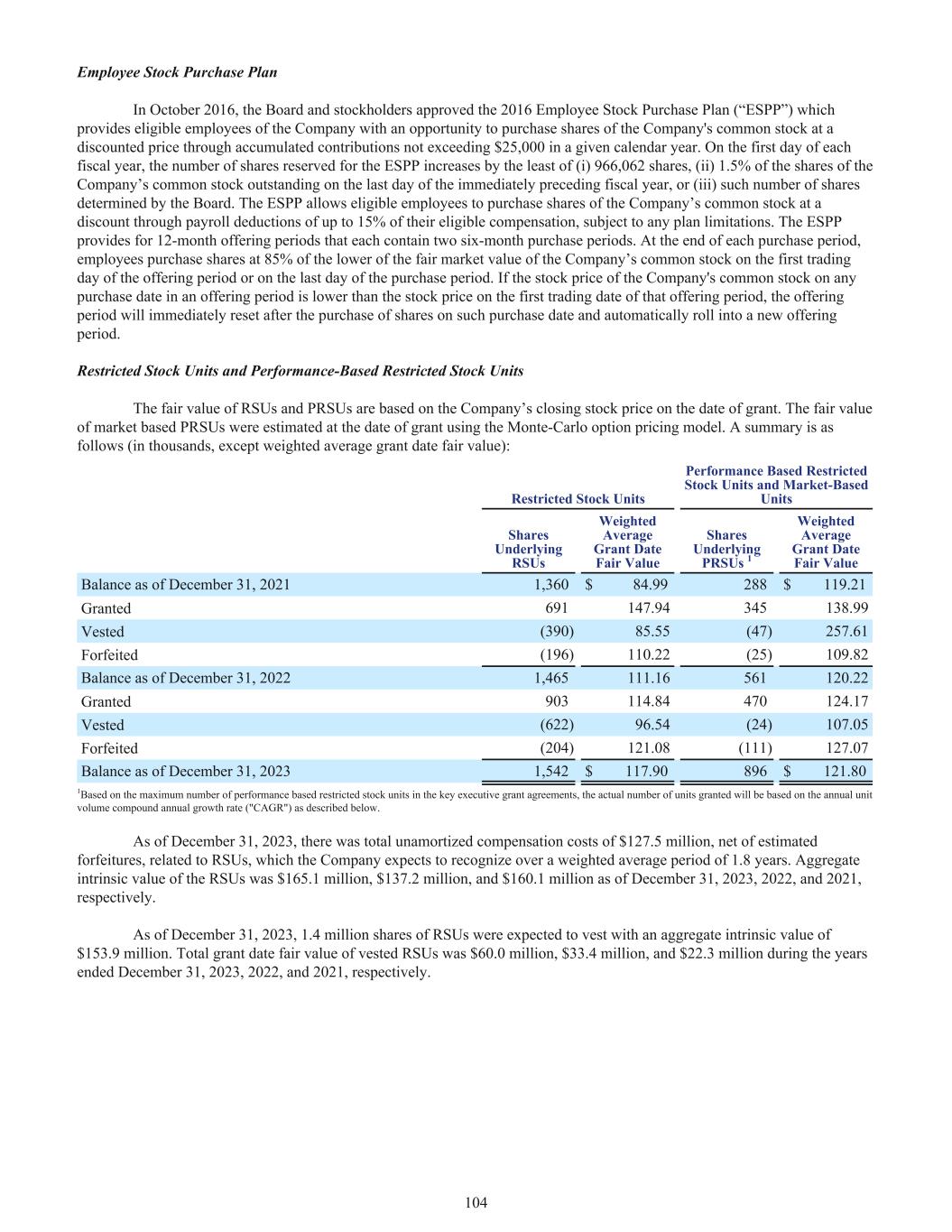 Employee Stock Purchase Plan In October 2016, the Board and stockholders approved the 2016 Employee Stock Purchase Plan (“ESPP”) which provides eligible employees of the Company with an opportunity to purchase shares of the Company's common stock at a discounted price through accumulated contributions not exceeding $25,000 in a given calendar year. On the first day of each fiscal year, the number of shares reserved for the ESPP increases by the least of (i) 966,062 shares, (ii) 1.5% of the shares of the Company’s common stock outstanding on the last day of the immediately preceding fiscal year, or (iii) such number of shares determined by the Board. The ESPP allows eligible employees to purchase shares of the Company’s common stock at a discount through payroll deductions of up to 15% of their eligible compensation, subject to any plan limitations. The ESPP provides for 12-month offering periods that each contain two six-month purchase periods. At the end of each purchase period, employees purchase shares at 85% of the lower of the fair market value of the Company’s common stock on the first trading day of the offering period or on the last day of the purchase period. If the stock price of the Company's common stock on any purchase date in an offering period is lower than the stock price on the first trading date of that offering period, the offering period will immediately reset after the purchase of shares on such purchase date and automatically roll into a new offering period. Restricted Stock Units and Performance-Based Restricted Stock Units The fair value of RSUs and PRSUs are based on the Company’s closing stock price on the date of grant. The fair value of market based PRSUs were estimated at the date of grant using the Monte-Carlo option pricing model. A summary is as follows (in thousands, except weighted average grant date fair value): Restricted Stock Units Performance Based Restricted Stock Units and Market-Based Units Shares Underlying RSUs Weighted Average Grant Date Fair Value Shares Underlying PRSUs 1 Weighted Average Grant Date Fair Value Balance as of December 31, 2021 1,360 $ 84.99 288 $ 119.21 Granted 691 147.94 345 138.99 Vested (390) 85.55 (47) 257.61 Forfeited (196) 110.22 (25) 109.82 Balance as of December 31, 2022 1,465 111.16 561 120.22 Granted 903 114.84 470 124.17 Vested (622) 96.54 (24) 107.05 Forfeited (204) 121.08 (111) 127.07 Balance as of December 31, 2023 1,542 $ 117.90 896 $ 121.80 1Based on the maximum number of performance based restricted stock units in the key executive grant agreements, the actual number of units granted will be based on the annual unit volume compound annual growth rate ("CAGR") as described below. As of December 31, 2023, there was total unamortized compensation costs of $127.5 million, net of estimated forfeitures, related to RSUs, which the Company expects to recognize over a weighted average period of 1.8 years. Aggregate intrinsic value of the RSUs was $165.1 million, $137.2 million, and $160.1 million as of December 31, 2023, 2022, and 2021, respectively. As of December 31, 2023, 1.4 million shares of RSUs were expected to vest with an aggregate intrinsic value of $153.9 million. Total grant date fair value of vested RSUs was $60.0 million, $33.4 million, and $22.3 million during the years ended December 31, 2023, 2022, and 2021, respectively. 104