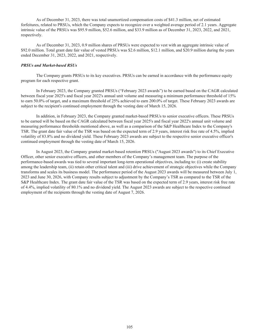 As of December 31, 2023, there was total unamortized compensation costs of $41.3 million, net of estimated forfeitures, related to PRSUs, which the Company expects to recognize over a weighted average period of 2.1 years. Aggregate intrinsic value of the PRSUs was $95.9 million, $52.6 million, and $33.9 million as of December 31, 2023, 2022, and 2021, respectively. As of December 31, 2023, 0.9 million shares of PRSUs were expected to vest with an aggregate intrinsic value of $92.0 million. Total grant date fair value of vested PRSUs was $2.6 million, $12.1 million, and $20.9 million during the years ended December 31, 2023, 2022, and 2021, respectively. PRSUs and Market-based RSUs The Company grants PRSUs to its key executives. PRSUs can be earned in accordance with the performance equity program for each respective grant. In February 2023, the Company granted PRSUs (“February 2023 awards”) to be earned based on the CAGR calculated between fiscal year 2025's and fiscal year 2022's annual unit volume and measuring a minimum performance threshold of 15% to earn 50.0% of target, and a maximum threshold of 25% achieved to earn 200.0% of target. These February 2023 awards are subject to the recipient's continued employment through the vesting date of March 15, 2026. In addition, in February 2023, the Company granted market-based PRSUs to senior executive officers. These PRSUs to be earned will be based on the CAGR calculated between fiscal year 2025's and fiscal year 2022's annual unit volume and measuring performance thresholds mentioned above, as well as a comparison of the S&P Healthcare Index to the Company's TSR. The grant date fair value of the TSR was based on the expected term of 2.9 years, interest risk free rate of 4.5%, implied volatility of 83.8% and no dividend yield. These February 2023 awards are subject to the respective senior executive officer's continued employment through the vesting date of March 15, 2026. In August 2023, the Company granted market-based retention PRSUs ("August 2023 awards") to its Chief Executive Officer, other senior executive officers, and other members of the Company’s management team. The purpose of the performance-based awards was tied to several important long-term operational objectives, including to: (i) create stability among the leadership team, (ii) retain other critical talent and (iii) drive achievement of strategic objectives while the Company transforms and scales its business model. The performance period of the August 2023 awards will be measured between July 1, 2023 and June 30, 2026, with Company results subject to adjustment by the Company’s TSR as compared to the TSR of the S&P Healthcare Index. The grant date fair value of the TSR was based on the expected term of 2.9 years, interest risk free rate of 4.4%, implied volatility of 80.1% and no dividend yield. The August 2023 awards are subject to the respective continued employment of the recipients through the vesting date of August 7, 2026. 105