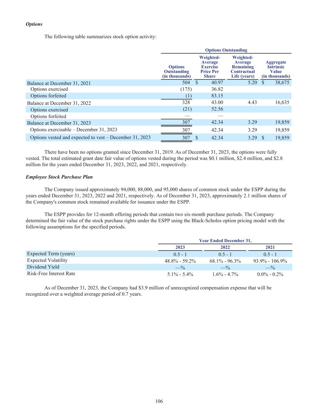 Options The following table summarizes stock option activity: Options Outstanding Options Outstanding (in thousands) Weighted- Average Exercise Price Per Share Weighted- Average Remaining Contractual Life (years) Aggregate Intrinsic Value (in thousands) Balance at December 31, 2021 504 $ 40.97 5.20 $ 38,675 Options exercised (175) 36.82 Options forfeited (1) 83.15 Balance at December 31, 2022 328 43.00 4.43 16,635 Options exercised (21) 52.56 Options forfeited — — Balance at December 31, 2023 307 42.34 3.29 19,859 Options exercisable – December 31, 2023 307 42.34 3.29 19,859 Options vested and expected to vest – December 31, 2023 307 $ 42.34 3.29 $ 19,859 There have been no options granted since December 31, 2019. As of December 31, 2023, the options were fully vested. The total estimated grant date fair value of options vested during the period was $0.1 million, $2.4 million, and $2.8 million for the years ended December 31, 2023, 2022, and 2021, respectively. Employee Stock Purchase Plan The Company issued approximately 94,000, 88,000, and 95,000 shares of common stock under the ESPP during the years ended December 31, 2023, 2022 and 2021, respectively. As of December 31, 2023, approximately 2.1 million shares of the Company's common stock remained available for issuance under the ESPP. The ESPP provides for 12-month offering periods that contain two six-month purchase periods. The Company determined the fair value of the stock purchase rights under the ESPP using the Black-Scholes option pricing model with the following assumptions for the specified periods. Year Ended December 31, 2023 2022 2021 Expected Term (years) 0.5 - 1 0.5 - 1 0.5 - 1 Expected Volatility 48.8% - 59.2% 68.1% - 96.3% 93.9% - 106.9% Dividend Yield —% —% —% Risk-Free Interest Rate 5.1% - 5.4% 1.6% - 4.7% 0.0% - 0.2% As of December 31, 2023, the Company had $3.9 million of unrecognized compensation expense that will be recognized over a weighted average period of 0.7 years. 106