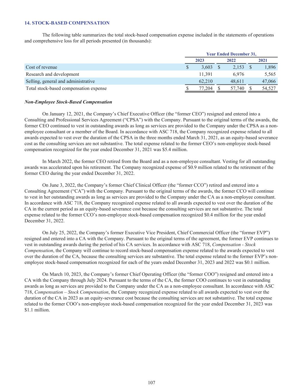 14. STOCK-BASED COMPENSATION The following table summarizes the total stock-based compensation expense included in the statements of operations and comprehensive loss for all periods presented (in thousands): Year Ended December 31, 2023 2022 2021 Cost of revenue $ 3,603 $ 2,153 $ 1,896 Research and development 11,391 6,976 5,565 Selling, general and administrative 62,210 48,611 47,066 Total stock-based compensation expense $ 77,204 $ 57,740 $ 54,527 Non-Employee Stock-Based Compensation On January 12, 2021, the Company’s Chief Executive Officer (the “former CEO”) resigned and entered into a Consulting and Professional Services Agreement (“CPSA”) with the Company. Pursuant to the original terms of the awards, the former CEO continued to vest in outstanding awards as long as services are provided to the Company under the CPSA as a non- employee consultant or a member of the Board. In accordance with ASC 718, the Company recognized expense related to all awards expected to vest over the duration of the CPSA in the three months ended March 31, 2021, as an equity-based severance cost as the consulting services are not substantive. The total expense related to the former CEO’s non-employee stock-based compensation recognized for the year ended December 31, 2021 was $5.4 million. In March 2022, the former CEO retired from the Board and as a non-employee consultant. Vesting for all outstanding awards was accelerated upon his retirement. The Company recognized expense of $0.9 million related to the retirement of the former CEO during the year ended December 31, 2022. On June 3, 2022, the Company’s former Chief Clinical Officer (the “former CCO”) retired and entered into a Consulting Agreement (“CA”) with the Company. Pursuant to the original terms of the awards, the former CCO will continue to vest in her outstanding awards as long as services are provided to the Company under the CA as a non-employee consultant. In accordance with ASC 718, the Company recognized expense related to all awards expected to vest over the duration of the CA in the current period as an equity-based severance cost because the consulting services are not substantive. The total expense related to the former CCO’s non-employee stock-based compensation recognized $0.4 million for the year ended December 31, 2022. On July 25, 2022, the Company’s former Executive Vice President, Chief Commercial Officer (the “former EVP”) resigned and entered into a CA with the Company. Pursuant to the original terms of the agreement, the former EVP continues to vest in outstanding awards during the period of his CA services. In accordance with ASC 718, Compensation - Stock Compensation, the Company will continue to record stock-based compensation expense related to the awards expected to vest over the duration of the CA, because the consulting services are substantive. The total expense related to the former EVP’s non- employee stock-based compensation recognized for each of the years ended December 31, 2023 and 2022 was $0.1 million. On March 10, 2023, the Company’s former Chief Operating Officer (the “former COO”) resigned and entered into a CA with the Company through July 2024. Pursuant to the terms of the CA, the former COO continues to vest in outstanding awards as long as services are provided to the Company under the CA as a non-employee consultant. In accordance with ASC 718, Compensation – Stock Compensation, the Company recognized expense related to all awards expected to vest over the duration of the CA in 2023 as an equity-severance cost because the consulting services are not substantive. The total expense related to the former COO’s non-employee stock-based compensation recognized for the year ended December 31, 2023 was $1.1 million. 107