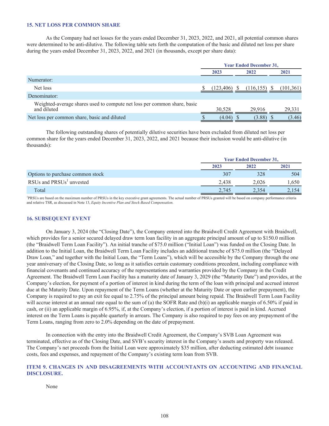 15. NET LOSS PER COMMON SHARE As the Company had net losses for the years ended December 31, 2023, 2022, and 2021, all potential common shares were determined to be anti-dilutive. The following table sets forth the computation of the basic and diluted net loss per share during the years ended December 31, 2023, 2022, and 2021 (in thousands, except per share data): Year Ended December 31, 2023 2022 2021 Numerator: Net loss $ (123,406) $ (116,155) $ (101,361) Denominator: Weighted-average shares used to compute net loss per common share, basic and diluted 30,528 29,916 29,331 Net loss per common share, basic and diluted $ (4.04) $ (3.88) $ (3.46) The following outstanding shares of potentially dilutive securities have been excluded from diluted net loss per common share for the years ended December 31, 2023, 2022, and 2021 because their inclusion would be anti-dilutive (in thousands): Year Ended December 31, 2023 2022 2021 Options to purchase common stock 307 328 504 RSUs and PRSUs1 unvested 2,438 2,026 1,650 Total 2,745 2,354 2,154 1PRSUs are based on the maximum number of PRSUs in the key executive grant agreements. The actual number of PRSUs granted will be based on company performance criteria and relative TSR, as discussed in Note 13, Equity Incentive Plan and Stock-Based Compensation. 16. SUBSEQUENT EVENT On January 3, 2024 (the “Closing Date”), the Company entered into the Braidwell Credit Agreement with Braidwell, which provides for a senior secured delayed draw term loan facility in an aggregate principal amount of up to $150.0 million (the “Braidwell Term Loan Facility”). An initial tranche of $75.0 million (“Initial Loan”) was funded on the Closing Date. In addition to the Initial Loan, the Braidwell Term Loan Facility includes an additional tranche of $75.0 million (the “Delayed Draw Loan,” and together with the Initial Loan, the “Term Loans”), which will be accessible by the Company through the one year anniversary of the Closing Date, so long as it satisfies certain customary conditions precedent, including compliance with financial covenants and continued accuracy of the representations and warranties provided by the Company in the Credit Agreement. The Braidwell Term Loan Facility has a maturity date of January 3, 2029 (the “Maturity Date”) and provides, at the Company’s election, for payment of a portion of interest in kind during the term of the loan with principal and accrued interest due at the Maturity Date. Upon repayment of the Term Loans (whether at the Maturity Date or upon earlier prepayment), the Company is required to pay an exit fee equal to 2.75% of the principal amount being repaid. The Braidwell Term Loan Facility will accrue interest at an annual rate equal to the sum of (a) the SOFR Rate and (b)(i) an applicable margin of 6.50% if paid in cash, or (ii) an applicable margin of 6.95%, if, at the Company’s election, if a portion of interest is paid in kind. Accrued interest on the Term Loans is payable quarterly in arrears. The Company is also required to pay fees on any prepayment of the Term Loans, ranging from zero to 2.0% depending on the date of prepayment. In connection with the entry into the Braidwell Credit Agreement, the Company’s SVB Loan Agreement was terminated, effective as of the Closing Date, and SVB’s security interest in the Company’s assets and property was released. The Company’s net proceeds from the Initial Loan were approximately $35 million, after deducting estimated debt issuance costs, fees and expenses, and repayment of the Company’s existing term loan from SVB. ITEM 9. CHANGES IN AND DISAGREEMENTS WITH ACCOUNTANTS ON ACCOUNTING AND FINANCIAL DISCLOSURE. None 108