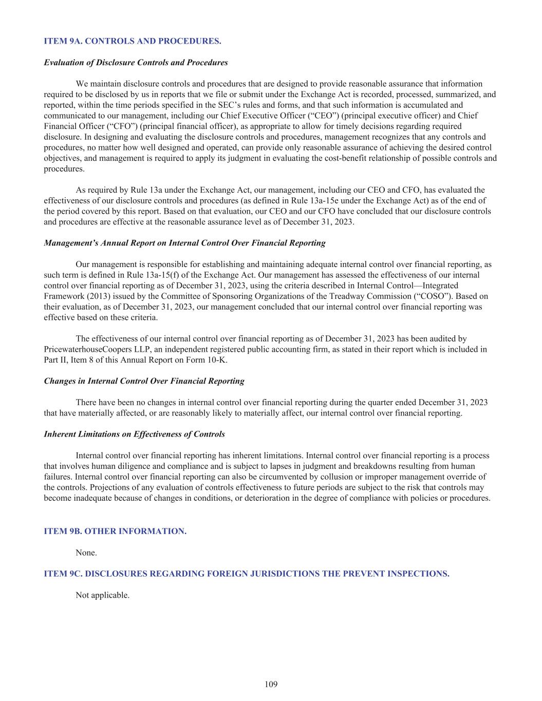 ITEM 9A. CONTROLS AND PROCEDURES. Evaluation of Disclosure Controls and Procedures We maintain disclosure controls and procedures that are designed to provide reasonable assurance that information required to be disclosed by us in reports that we file or submit under the Exchange Act is recorded, processed, summarized, and reported, within the time periods specified in the SEC’s rules and forms, and that such information is accumulated and communicated to our management, including our Chief Executive Officer (“CEO”) (principal executive officer) and Chief Financial Officer (“CFO”) (principal financial officer), as appropriate to allow for timely decisions regarding required disclosure. In designing and evaluating the disclosure controls and procedures, management recognizes that any controls and procedures, no matter how well designed and operated, can provide only reasonable assurance of achieving the desired control objectives, and management is required to apply its judgment in evaluating the cost-benefit relationship of possible controls and procedures. As required by Rule 13a under the Exchange Act, our management, including our CEO and CFO, has evaluated the effectiveness of our disclosure controls and procedures (as defined in Rule 13a-15e under the Exchange Act) as of the end of the period covered by this report. Based on that evaluation, our CEO and our CFO have concluded that our disclosure controls and procedures are effective at the reasonable assurance level as of December 31, 2023. Management’s Annual Report on Internal Control Over Financial Reporting Our management is responsible for establishing and maintaining adequate internal control over financial reporting, as such term is defined in Rule 13a-15(f) of the Exchange Act. Our management has assessed the effectiveness of our internal control over financial reporting as of December 31, 2023, using the criteria described in Internal Control—Integrated Framework (2013) issued by the Committee of Sponsoring Organizations of the Treadway Commission (“COSO”). Based on their evaluation, as of December 31, 2023, our management concluded that our internal control over financial reporting was effective based on these criteria. The effectiveness of our internal control over financial reporting as of December 31, 2023 has been audited by PricewaterhouseCoopers LLP, an independent registered public accounting firm, as stated in their report which is included in Part II, Item 8 of this Annual Report on Form 10-K. Changes in Internal Control Over Financial Reporting There have been no changes in internal control over financial reporting during the quarter ended December 31, 2023 that have materially affected, or are reasonably likely to materially affect, our internal control over financial reporting. Inherent Limitations on Effectiveness of Controls Internal control over financial reporting has inherent limitations. Internal control over financial reporting is a process that involves human diligence and compliance and is subject to lapses in judgment and breakdowns resulting from human failures. Internal control over financial reporting can also be circumvented by collusion or improper management override of the controls. Projections of any evaluation of controls effectiveness to future periods are subject to the risk that controls may become inadequate because of changes in conditions, or deterioration in the degree of compliance with policies or procedures. ITEM 9B. OTHER INFORMATION. None. ITEM 9C. DISCLOSURES REGARDING FOREIGN JURISDICTIONS THE PREVENT INSPECTIONS. Not applicable. 109