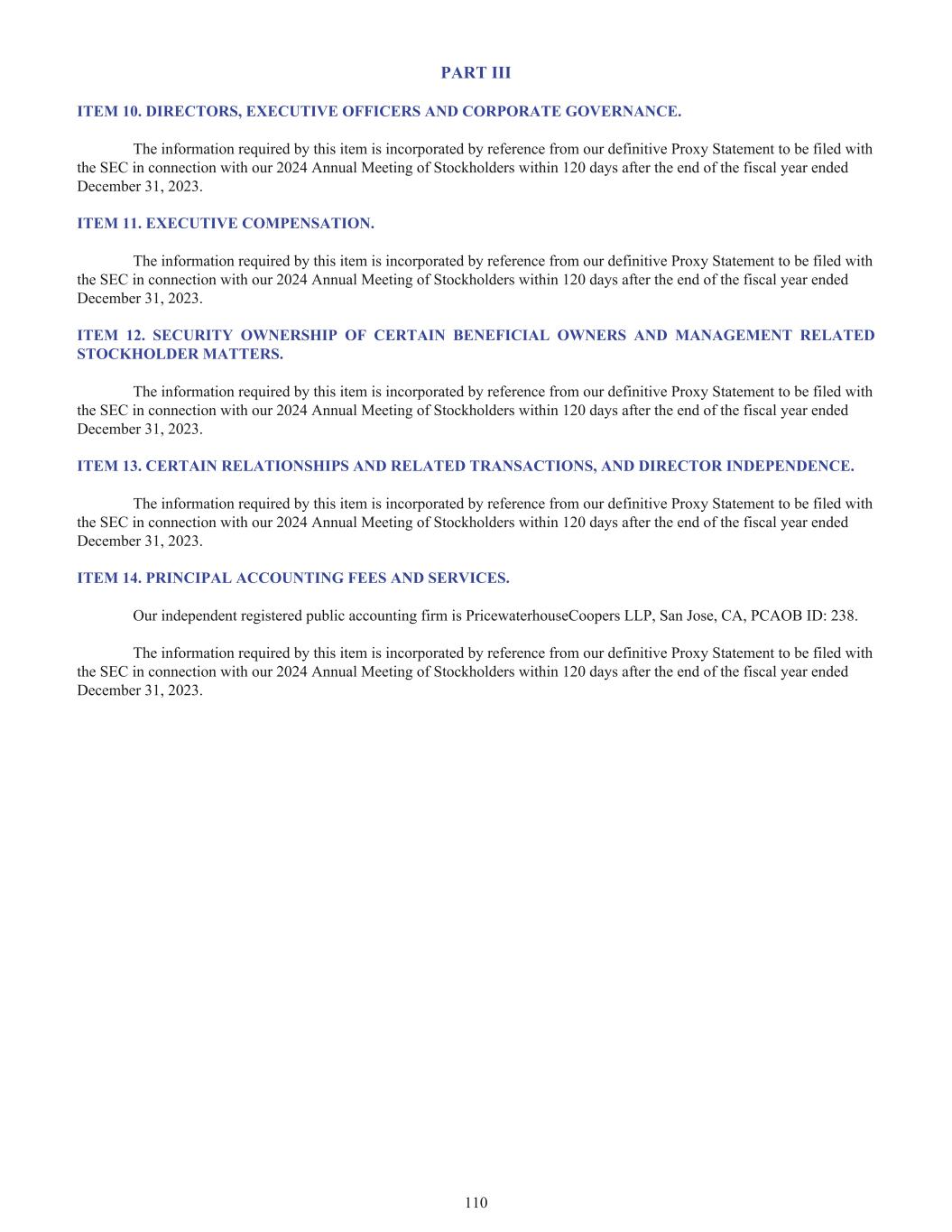 PART III ITEM 10. DIRECTORS, EXECUTIVE OFFICERS AND CORPORATE GOVERNANCE. The information required by this item is incorporated by reference from our definitive Proxy Statement to be filed with the SEC in connection with our 2024 Annual Meeting of Stockholders within 120 days after the end of the fiscal year ended December 31, 2023. ITEM 11. EXECUTIVE COMPENSATION. The information required by this item is incorporated by reference from our definitive Proxy Statement to be filed with the SEC in connection with our 2024 Annual Meeting of Stockholders within 120 days after the end of the fiscal year ended December 31, 2023. ITEM 12. SECURITY OWNERSHIP OF CERTAIN BENEFICIAL OWNERS AND MANAGEMENT RELATED STOCKHOLDER MATTERS. The information required by this item is incorporated by reference from our definitive Proxy Statement to be filed with the SEC in connection with our 2024 Annual Meeting of Stockholders within 120 days after the end of the fiscal year ended December 31, 2023. ITEM 13. CERTAIN RELATIONSHIPS AND RELATED TRANSACTIONS, AND DIRECTOR INDEPENDENCE. The information required by this item is incorporated by reference from our definitive Proxy Statement to be filed with the SEC in connection with our 2024 Annual Meeting of Stockholders within 120 days after the end of the fiscal year ended December 31, 2023. ITEM 14. PRINCIPAL ACCOUNTING FEES AND SERVICES. Our independent registered public accounting firm is PricewaterhouseCoopers LLP, San Jose, CA, PCAOB ID: 238. The information required by this item is incorporated by reference from our definitive Proxy Statement to be filed with the SEC in connection with our 2024 Annual Meeting of Stockholders within 120 days after the end of the fiscal year ended December 31, 2023. 110