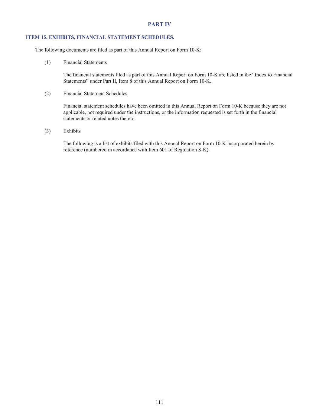 PART IV ITEM 15. EXHIBITS, FINANCIAL STATEMENT SCHEDULES. The following documents are filed as part of this Annual Report on Form 10-K: (1) Financial Statements The financial statements filed as part of this Annual Report on Form 10-K are listed in the “Index to Financial Statements” under Part II, Item 8 of this Annual Report on Form 10-K. (2) Financial Statement Schedules Financial statement schedules have been omitted in this Annual Report on Form 10-K because they are not applicable, not required under the instructions, or the information requested is set forth in the financial statements or related notes thereto. (3) Exhibits The following is a list of exhibits filed with this Annual Report on Form 10-K incorporated herein by reference (numbered in accordance with Item 601 of Regulation S-K). 111