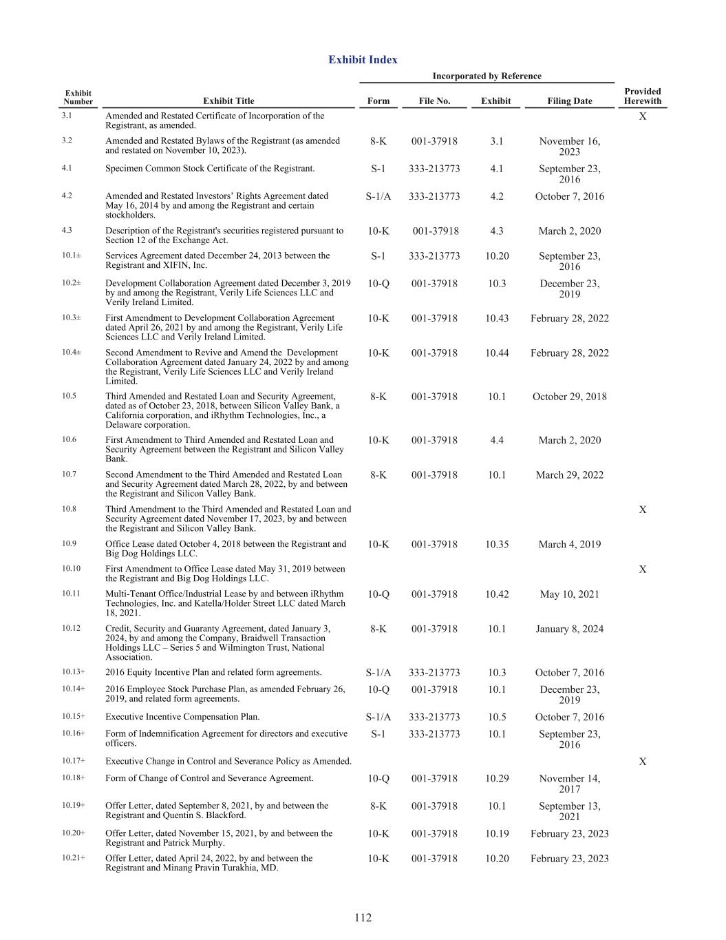 Exhibit Index Incorporated by Reference Exhibit Number Exhibit Title Form File No. Exhibit Filing Date Provided Herewith 3.1 Amended and Restated Certificate of Incorporation of the Registrant, as amended. X 3.2 Amended and Restated Bylaws of the Registrant (as amended and restated on November 10, 2023). 8-K 001-37918 3.1 November 16, 2023 4.1 Specimen Common Stock Certificate of the Registrant. S-1 333-213773 4.1 September 23, 2016 4.2 Amended and Restated Investors’ Rights Agreement dated May 16, 2014 by and among the Registrant and certain stockholders. S-1/A 333-213773 4.2 October 7, 2016 4.3 Description of the Registrant's securities registered pursuant to Section 12 of the Exchange Act. 10-K 001-37918 4.3 March 2, 2020 10.1± Services Agreement dated December 24, 2013 between the Registrant and XIFIN, Inc. S-1 333-213773 10.20 September 23, 2016 10.2± Development Collaboration Agreement dated December 3, 2019 by and among the Registrant, Verily Life Sciences LLC and Verily Ireland Limited. 10-Q 001-37918 10.3 December 23, 2019 10.3± First Amendment to Development Collaboration Agreement dated April 26, 2021 by and among the Registrant, Verily Life Sciences LLC and Verily Ireland Limited. 10-K 001-37918 10.43 February 28, 2022 10.4± Second Amendment to Revive and Amend the Development Collaboration Agreement dated January 24, 2022 by and among the Registrant, Verily Life Sciences LLC and Verily Ireland Limited. 10-K 001-37918 10.44 February 28, 2022 10.5 Third Amended and Restated Loan and Security Agreement, dated as of October 23, 2018, between Silicon Valley Bank, a California corporation, and iRhythm Technologies, Inc., a Delaware corporation. 8-K 001-37918 10.1 October 29, 2018 10.6 First Amendment to Third Amended and Restated Loan and Security Agreement between the Registrant and Silicon Valley Bank. 10-K 001-37918 4.4 March 2, 2020 10.7 Second Amendment to the Third Amended and Restated Loan and Security Agreement dated March 28, 2022, by and between the Registrant and Silicon Valley Bank. 8-K 001-37918 10.1 March 29, 2022 10.8 Third Amendment to the Third Amended and Restated Loan and Security Agreement dated November 17, 2023, by and between the Registrant and Silicon Valley Bank. X 10.9 Office Lease dated October 4, 2018 between the Registrant and Big Dog Holdings LLC. 10-K 001-37918 10.35 March 4, 2019 10.10 First Amendment to Office Lease dated May 31, 2019 between the Registrant and Big Dog Holdings LLC. X 10.11 Multi-Tenant Office/Industrial Lease by and between iRhythm Technologies, Inc. and Katella/Holder Street LLC dated March 18, 2021. 10-Q 001-37918 10.42 May 10, 2021 10.12 Credit, Security and Guaranty Agreement, dated January 3, 2024, by and among the Company, Braidwell Transaction Holdings LLC – Series 5 and Wilmington Trust, National Association. 8-K 001-37918 10.1 January 8, 2024 10.13+ 2016 Equity Incentive Plan and related form agreements. S-1/A 333-213773 10.3 October 7, 2016 10.14+ 2016 Employee Stock Purchase Plan, as amended February 26, 2019, and related form agreements. 10-Q 001-37918 10.1 December 23, 2019 10.15+ Executive Incentive Compensation Plan. S-1/A 333-213773 10.5 October 7, 2016 10.16+ Form of Indemnification Agreement for directors and executive officers. S-1 333-213773 10.1 September 23, 2016 10.17+ Executive Change in Control and Severance Policy as Amended. X 10.18+ Form of Change of Control and Severance Agreement. 10-Q 001-37918 10.29 November 14, 2017 10.19+ Offer Letter, dated September 8, 2021, by and between the Registrant and Quentin S. Blackford. 8-K 001-37918 10.1 September 13, 2021 10.20+ Offer Letter, dated November 15, 2021, by and between the Registrant and Patrick Murphy. 10-K 001-37918 10.19 February 23, 2023 10.21+ Offer Letter, dated April 24, 2022, by and between the Registrant and Minang Pravin Turakhia, MD. 10-K 001-37918 10.20 February 23, 2023 112