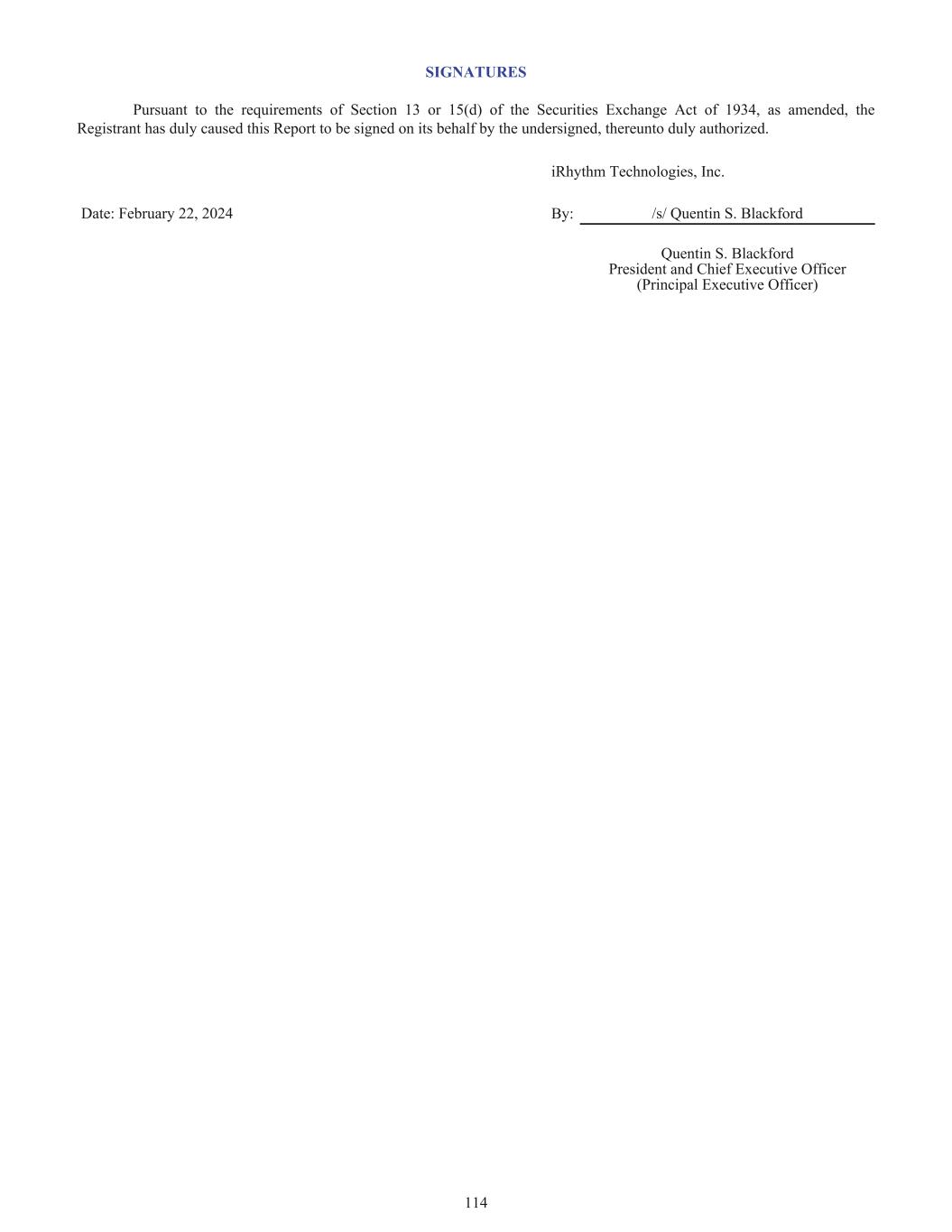 SIGNATURES Pursuant to the requirements of Section 13 or 15(d) of the Securities Exchange Act of 1934, as amended, the Registrant has duly caused this Report to be signed on its behalf by the undersigned, thereunto duly authorized. iRhythm Technologies, Inc. Date: February 22, 2024 By: /s/ Quentin S. Blackford Quentin S. Blackford President and Chief Executive Officer (Principal Executive Officer) 114