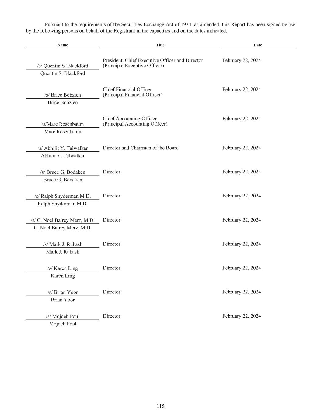 Pursuant to the requirements of the Securities Exchange Act of 1934, as amended, this Report has been signed below by the following persons on behalf of the Registrant in the capacities and on the dates indicated. Name Title Date /s/ Quentin S. Blackford President, Chief Executive Officer and Director (Principal Executive Officer) February 22, 2024 Quentin S. Blackford /s/ Brice Bobzien Chief Financial Officer (Principal Financial Officer) February 22, 2024 Brice Bobzien /s/Marc Rosenbaum Chief Accounting Officer (Principal Accounting Officer) February 22, 2024 Marc Rosenbaum /s/ Abhijit Y. Talwalkar Director and Chairman of the Board February 22, 2024 Abhijit Y. Talwalkar /s/ Bruce G. Bodaken Director February 22, 2024 Bruce G. Bodaken /s/ Ralph Snyderman M.D. Director February 22, 2024 Ralph Snyderman M.D. /s/ C. Noel Bairey Merz, M.D. Director February 22, 2024 C. Noel Bairey Merz, M.D. /s/ Mark J. Rubash Director February 22, 2024 Mark J. Rubash /s/ Karen Ling Director February 22, 2024 Karen Ling /s/ Brian Yoor Director February 22, 2024 Brian Yoor /s/ Mojdeh Poul Director February 22, 2024 Mojdeh Poul 115