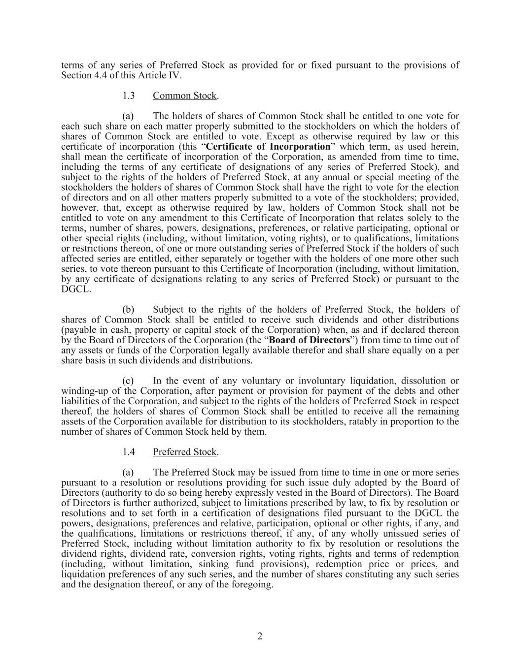 terms of any series of Preferred Stock as provided for or fixed pursuant to the provisions of Section 4.4 of this Article IV. 1.3 Common Stock. (a) The holders of shares of Common Stock shall be entitled to one vote for each such share on each matter properly submitted to the stockholders on which the holders of shares of Common Stock are entitled to vote. Except as otherwise required by law or this certificate of incorporation (this “Certificate of Incorporation” which term, as used herein, shall mean the certificate of incorporation of the Corporation, as amended from time to time, including the terms of any certificate of designations of any series of Preferred Stock), and subject to the rights of the holders of Preferred Stock, at any annual or special meeting of the stockholders the holders of shares of Common Stock shall have the right to vote for the election of directors and on all other matters properly submitted to a vote of the stockholders; provided, however, that, except as otherwise required by law, holders of Common Stock shall not be entitled to vote on any amendment to this Certificate of Incorporation that relates solely to the terms, number of shares, powers, designations, preferences, or relative participating, optional or other special rights (including, without limitation, voting rights), or to qualifications, limitations or restrictions thereon, of one or more outstanding series of Preferred Stock if the holders of such affected series are entitled, either separately or together with the holders of one more other such series, to vote thereon pursuant to this Certificate of Incorporation (including, without limitation, by any certificate of designations relating to any series of Preferred Stock) or pursuant to the DGCL. (b) Subject to the rights of the holders of Preferred Stock, the holders of shares of Common Stock shall be entitled to receive such dividends and other distributions (payable in cash, property or capital stock of the Corporation) when, as and if declared thereon by the Board of Directors of the Corporation (the “Board of Directors”) from time to time out of any assets or funds of the Corporation legally available therefor and shall share equally on a per share basis in such dividends and distributions. (c) In the event of any voluntary or involuntary liquidation, dissolution or winding-up of the Corporation, after payment or provision for payment of the debts and other liabilities of the Corporation, and subject to the rights of the holders of Preferred Stock in respect thereof, the holders of shares of Common Stock shall be entitled to receive all the remaining assets of the Corporation available for distribution to its stockholders, ratably in proportion to the number of shares of Common Stock held by them. 1.4 Preferred Stock. (a) The Preferred Stock may be issued from time to time in one or more series pursuant to a resolution or resolutions providing for such issue duly adopted by the Board of Directors (authority to do so being hereby expressly vested in the Board of Directors). The Board of Directors is further authorized, subject to limitations prescribed by law, to fix by resolution or resolutions and to set forth in a certification of designations filed pursuant to the DGCL the powers, designations, preferences and relative, participation, optional or other rights, if any, and the qualifications, limitations or restrictions thereof, if any, of any wholly unissued series of Preferred Stock, including without limitation authority to fix by resolution or resolutions the dividend rights, dividend rate, conversion rights, voting rights, rights and terms of redemption (including, without limitation, sinking fund provisions), redemption price or prices, and liquidation preferences of any such series, and the number of shares constituting any such series and the designation thereof, or any of the foregoing. 2