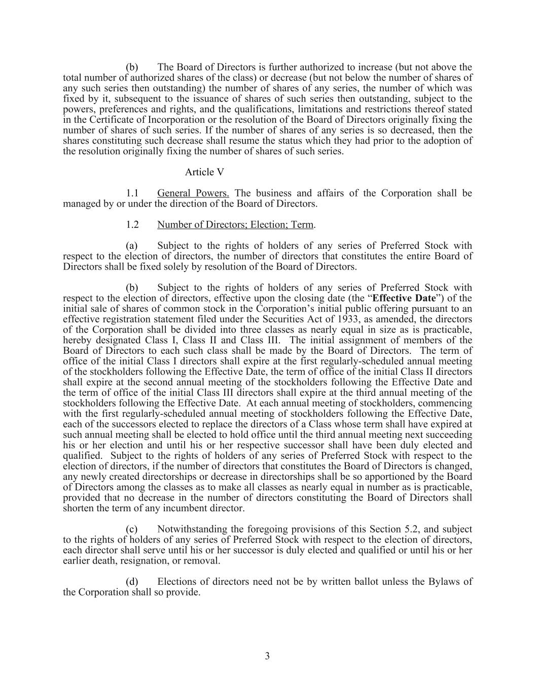(b) The Board of Directors is further authorized to increase (but not above the total number of authorized shares of the class) or decrease (but not below the number of shares of any such series then outstanding) the number of shares of any series, the number of which was fixed by it, subsequent to the issuance of shares of such series then outstanding, subject to the powers, preferences and rights, and the qualifications, limitations and restrictions thereof stated in the Certificate of Incorporation or the resolution of the Board of Directors originally fixing the number of shares of such series. If the number of shares of any series is so decreased, then the shares constituting such decrease shall resume the status which they had prior to the adoption of the resolution originally fixing the number of shares of such series. Article V 1.1 General Powers. The business and affairs of the Corporation shall be managed by or under the direction of the Board of Directors. 1.2 Number of Directors; Election; Term. (a) Subject to the rights of holders of any series of Preferred Stock with respect to the election of directors, the number of directors that constitutes the entire Board of Directors shall be fixed solely by resolution of the Board of Directors. (b) Subject to the rights of holders of any series of Preferred Stock with respect to the election of directors, effective upon the closing date (the “Effective Date”) of the initial sale of shares of common stock in the Corporation’s initial public offering pursuant to an effective registration statement filed under the Securities Act of 1933, as amended, the directors of the Corporation shall be divided into three classes as nearly equal in size as is practicable, hereby designated Class I, Class II and Class III. The initial assignment of members of the Board of Directors to each such class shall be made by the Board of Directors. The term of office of the initial Class I directors shall expire at the first regularly-scheduled annual meeting of the stockholders following the Effective Date, the term of office of the initial Class II directors shall expire at the second annual meeting of the stockholders following the Effective Date and the term of office of the initial Class III directors shall expire at the third annual meeting of the stockholders following the Effective Date. At each annual meeting of stockholders, commencing with the first regularly-scheduled annual meeting of stockholders following the Effective Date, each of the successors elected to replace the directors of a Class whose term shall have expired at such annual meeting shall be elected to hold office until the third annual meeting next succeeding his or her election and until his or her respective successor shall have been duly elected and qualified. Subject to the rights of holders of any series of Preferred Stock with respect to the election of directors, if the number of directors that constitutes the Board of Directors is changed, any newly created directorships or decrease in directorships shall be so apportioned by the Board of Directors among the classes as to make all classes as nearly equal in number as is practicable, provided that no decrease in the number of directors constituting the Board of Directors shall shorten the term of any incumbent director. (c) Notwithstanding the foregoing provisions of this Section 5.2, and subject to the rights of holders of any series of Preferred Stock with respect to the election of directors, each director shall serve until his or her successor is duly elected and qualified or until his or her earlier death, resignation, or removal. (d) Elections of directors need not be by written ballot unless the Bylaws of the Corporation shall so provide. 3