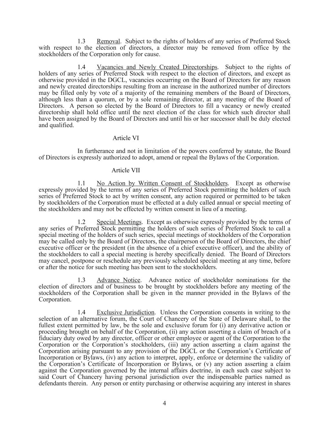 1.3 Removal. Subject to the rights of holders of any series of Preferred Stock with respect to the election of directors, a director may be removed from office by the stockholders of the Corporation only for cause. 1.4 Vacancies and Newly Created Directorships. Subject to the rights of holders of any series of Preferred Stock with respect to the election of directors, and except as otherwise provided in the DGCL, vacancies occurring on the Board of Directors for any reason and newly created directorships resulting from an increase in the authorized number of directors may be filled only by vote of a majority of the remaining members of the Board of Directors, although less than a quorum, or by a sole remaining director, at any meeting of the Board of Directors. A person so elected by the Board of Directors to fill a vacancy or newly created directorship shall hold office until the next election of the class for which such director shall have been assigned by the Board of Directors and until his or her successor shall be duly elected and qualified. Article VI In furtherance and not in limitation of the powers conferred by statute, the Board of Directors is expressly authorized to adopt, amend or repeal the Bylaws of the Corporation. Article VII 1.1 No Action by Written Consent of Stockholders. Except as otherwise expressly provided by the terms of any series of Preferred Stock permitting the holders of such series of Preferred Stock to act by written consent, any action required or permitted to be taken by stockholders of the Corporation must be effected at a duly called annual or special meeting of the stockholders and may not be effected by written consent in lieu of a meeting. 1.2 Special Meetings. Except as otherwise expressly provided by the terms of any series of Preferred Stock permitting the holders of such series of Preferred Stock to call a special meeting of the holders of such series, special meetings of stockholders of the Corporation may be called only by the Board of Directors, the chairperson of the Board of Directors, the chief executive officer or the president (in the absence of a chief executive officer), and the ability of the stockholders to call a special meeting is hereby specifically denied. The Board of Directors may cancel, postpone or reschedule any previously scheduled special meeting at any time, before or after the notice for such meeting has been sent to the stockholders. 1.3 Advance Notice. Advance notice of stockholder nominations for the election of directors and of business to be brought by stockholders before any meeting of the stockholders of the Corporation shall be given in the manner provided in the Bylaws of the Corporation. 1.4 Exclusive Jurisdiction. Unless the Corporation consents in writing to the selection of an alternative forum, the Court of Chancery of the State of Delaware shall, to the fullest extent permitted by law, be the sole and exclusive forum for (i) any derivative action or proceeding brought on behalf of the Corporation, (ii) any action asserting a claim of breach of a fiduciary duty owed by any director, officer or other employee or agent of the Corporation to the Corporation or the Corporation’s stockholders, (iii) any action asserting a claim against the Corporation arising pursuant to any provision of the DGCL or the Corporation’s Certificate of Incorporation or Bylaws, (iv) any action to interpret, apply, enforce or determine the validity of the Corporation’s Certificate of Incorporation or Bylaws, or (v) any action asserting a claim against the Corporation governed by the internal affairs doctrine, in each such case subject to said Court of Chancery having personal jurisdiction over the indispensable parties named as defendants therein. Any person or entity purchasing or otherwise acquiring any interest in shares 4