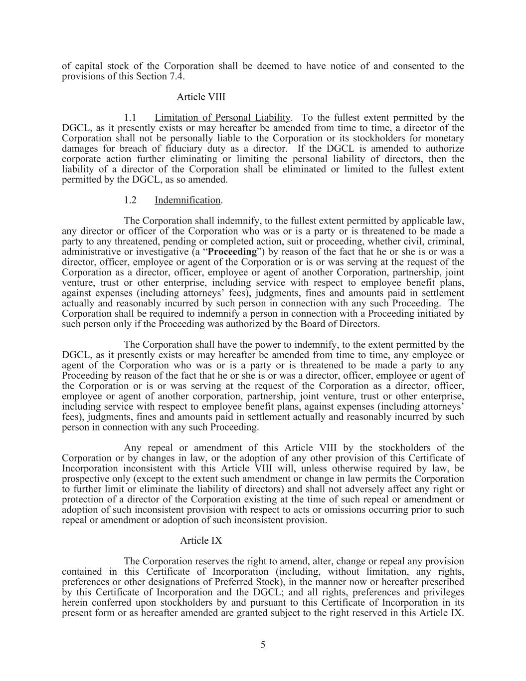 of capital stock of the Corporation shall be deemed to have notice of and consented to the provisions of this Section 7.4. Article VIII 1.1 Limitation of Personal Liability. To the fullest extent permitted by the DGCL, as it presently exists or may hereafter be amended from time to time, a director of the Corporation shall not be personally liable to the Corporation or its stockholders for monetary damages for breach of fiduciary duty as a director. If the DGCL is amended to authorize corporate action further eliminating or limiting the personal liability of directors, then the liability of a director of the Corporation shall be eliminated or limited to the fullest extent permitted by the DGCL, as so amended. 1.2 Indemnification. The Corporation shall indemnify, to the fullest extent permitted by applicable law, any director or officer of the Corporation who was or is a party or is threatened to be made a party to any threatened, pending or completed action, suit or proceeding, whether civil, criminal, administrative or investigative (a “Proceeding”) by reason of the fact that he or she is or was a director, officer, employee or agent of the Corporation or is or was serving at the request of the Corporation as a director, officer, employee or agent of another Corporation, partnership, joint venture, trust or other enterprise, including service with respect to employee benefit plans, against expenses (including attorneys’ fees), judgments, fines and amounts paid in settlement actually and reasonably incurred by such person in connection with any such Proceeding. The Corporation shall be required to indemnify a person in connection with a Proceeding initiated by such person only if the Proceeding was authorized by the Board of Directors. The Corporation shall have the power to indemnify, to the extent permitted by the DGCL, as it presently exists or may hereafter be amended from time to time, any employee or agent of the Corporation who was or is a party or is threatened to be made a party to any Proceeding by reason of the fact that he or she is or was a director, officer, employee or agent of the Corporation or is or was serving at the request of the Corporation as a director, officer, employee or agent of another corporation, partnership, joint venture, trust or other enterprise, including service with respect to employee benefit plans, against expenses (including attorneys’ fees), judgments, fines and amounts paid in settlement actually and reasonably incurred by such person in connection with any such Proceeding. Any repeal or amendment of this Article VIII by the stockholders of the Corporation or by changes in law, or the adoption of any other provision of this Certificate of Incorporation inconsistent with this Article VIII will, unless otherwise required by law, be prospective only (except to the extent such amendment or change in law permits the Corporation to further limit or eliminate the liability of directors) and shall not adversely affect any right or protection of a director of the Corporation existing at the time of such repeal or amendment or adoption of such inconsistent provision with respect to acts or omissions occurring prior to such repeal or amendment or adoption of such inconsistent provision. Article IX The Corporation reserves the right to amend, alter, change or repeal any provision contained in this Certificate of Incorporation (including, without limitation, any rights, preferences or other designations of Preferred Stock), in the manner now or hereafter prescribed by this Certificate of Incorporation and the DGCL; and all rights, preferences and privileges herein conferred upon stockholders by and pursuant to this Certificate of Incorporation in its present form or as hereafter amended are granted subject to the right reserved in this Article IX. 5