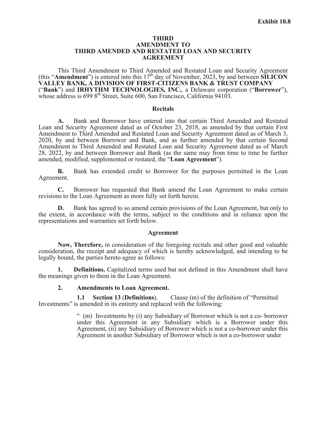 THIRD AMENDMENT TO THIRD AMENDED AND RESTATED LOAN AND SECURITY AGREEMENT This Third Amendment to Third Amended and Restated Loan and Security Agreement (this “Amendment”) is entered into this 17th day of November, 2023, by and between SILICON VALLEY BANK, A DIVISION OF FIRST-CITIZENS BANK & TRUST COMPANY (“Bank”) and IRHYTHM TECHNOLOGIES, INC., a Delaware corporation (“Borrower”), whose address is 699 8th Street, Suite 600, San Francisco, California 94103. Recitals A. Bank and Borrower have entered into that certain Third Amended and Restated Loan and Security Agreement dated as of October 23, 2018, as amended by that certain First Amendment to Third Amended and Restated Loan and Security Agreement dated as of March 3, 2020, by and between Borrower and Bank, and as further amended by that certain Second Amendment to Third Amended and Restated Loan and Security Agreement dated as of March 28, 2022, by and between Borrower and Bank (as the same may from time to time be further amended, modified, supplemented or restated, the “Loan Agreement”). B. Bank has extended credit to Borrower for the purposes permitted in the Loan Agreement. C. Borrower has requested that Bank amend the Loan Agreement to make certain revisions to the Loan Agreement as more fully set forth herein. D. Bank has agreed to so amend certain provisions of the Loan Agreement, but only to the extent, in accordance with the terms, subject to the conditions and in reliance upon the representations and warranties set forth below. Agreement Now, Therefore, in consideration of the foregoing recitals and other good and valuable consideration, the receipt and adequacy of which is hereby acknowledged, and intending to be legally bound, the parties hereto agree as follows: 1. Definitions. Capitalized terms used but not defined in this Amendment shall have the meanings given to them in the Loan Agreement. 2. Amendments to Loan Agreement. 1.1 Section 13 (Definitions). Clause (m) of the definition of “Permitted Investments” is amended in its entirety and replaced with the following: “ (m) Investments by (i) any Subsidiary of Borrower which is not a co- borrower under this Agreement in any Subsidiary which is a Borrower under this Agreement, (ii) any Subsidiary of Borrower which is not a co-borrower under this Agreement in another Subsidiary of Borrower which is not a co-borrower under Exhibit 10.8