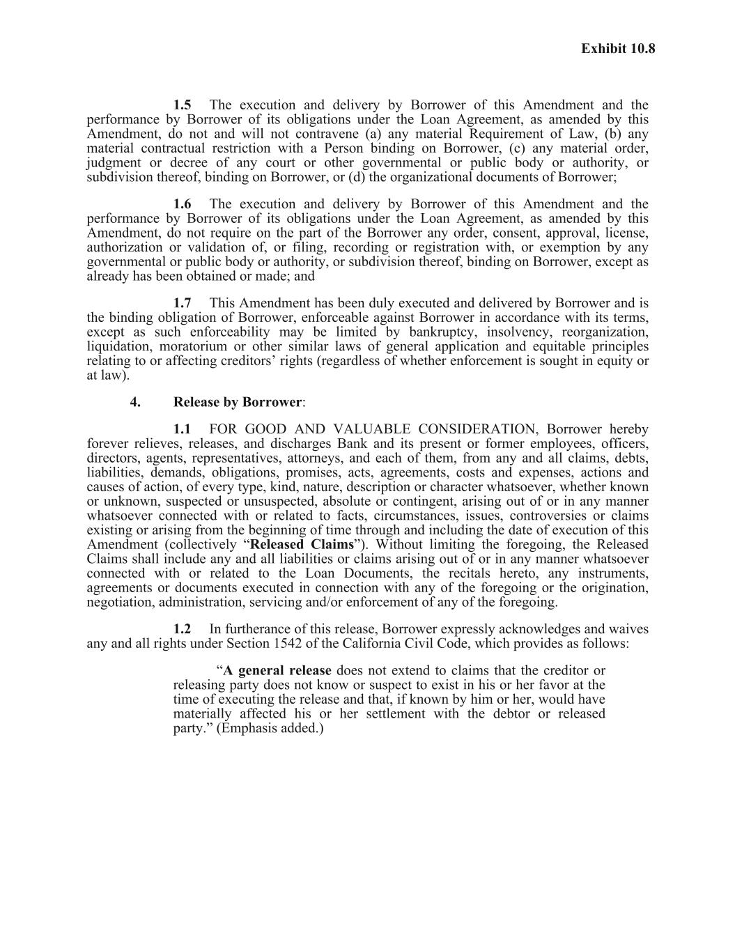 1.5 The execution and delivery by Borrower of this Amendment and the performance by Borrower of its obligations under the Loan Agreement, as amended by this Amendment, do not and will not contravene (a) any material Requirement of Law, (b) any material contractual restriction with a Person binding on Borrower, (c) any material order, judgment or decree of any court or other governmental or public body or authority, or subdivision thereof, binding on Borrower, or (d) the organizational documents of Borrower; 1.6 The execution and delivery by Borrower of this Amendment and the performance by Borrower of its obligations under the Loan Agreement, as amended by this Amendment, do not require on the part of the Borrower any order, consent, approval, license, authorization or validation of, or filing, recording or registration with, or exemption by any governmental or public body or authority, or subdivision thereof, binding on Borrower, except as already has been obtained or made; and 1.7 This Amendment has been duly executed and delivered by Borrower and is the binding obligation of Borrower, enforceable against Borrower in accordance with its terms, except as such enforceability may be limited by bankruptcy, insolvency, reorganization, liquidation, moratorium or other similar laws of general application and equitable principles relating to or affecting creditors’ rights (regardless of whether enforcement is sought in equity or at law). 4. Release by Borrower: 1.1 FOR GOOD AND VALUABLE CONSIDERATION, Borrower hereby forever relieves, releases, and discharges Bank and its present or former employees, officers, directors, agents, representatives, attorneys, and each of them, from any and all claims, debts, liabilities, demands, obligations, promises, acts, agreements, costs and expenses, actions and causes of action, of every type, kind, nature, description or character whatsoever, whether known or unknown, suspected or unsuspected, absolute or contingent, arising out of or in any manner whatsoever connected with or related to facts, circumstances, issues, controversies or claims existing or arising from the beginning of time through and including the date of execution of this Amendment (collectively “Released Claims”). Without limiting the foregoing, the Released Claims shall include any and all liabilities or claims arising out of or in any manner whatsoever connected with or related to the Loan Documents, the recitals hereto, any instruments, agreements or documents executed in connection with any of the foregoing or the origination, negotiation, administration, servicing and/or enforcement of any of the foregoing. 1.2 In furtherance of this release, Borrower expressly acknowledges and waives any and all rights under Section 1542 of the California Civil Code, which provides as follows: “A general release does not extend to claims that the creditor or releasing party does not know or suspect to exist in his or her favor at the time of executing the release and that, if known by him or her, would have materially affected his or her settlement with the debtor or released party.” (Emphasis added.) Exhibit 10.8