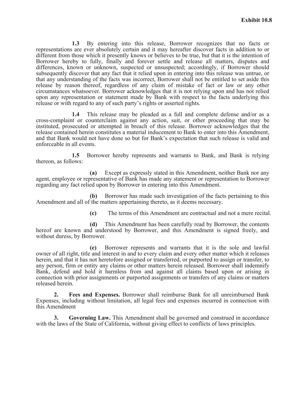 1.3 By entering into this release, Borrower recognizes that no facts or representations are ever absolutely certain and it may hereafter discover facts in addition to or different from those which it presently knows or believes to be true, but that it is the intention of Borrower hereby to fully, finally and forever settle and release all matters, disputes and differences, known or unknown, suspected or unsuspected; accordingly, if Borrower should subsequently discover that any fact that it relied upon in entering into this release was untrue, or that any understanding of the facts was incorrect, Borrower shall not be entitled to set aside this release by reason thereof, regardless of any claim of mistake of fact or law or any other circumstances whatsoever. Borrower acknowledges that it is not relying upon and has not relied upon any representation or statement made by Bank with respect to the facts underlying this release or with regard to any of such party’s rights or asserted rights. 1.4 This release may be pleaded as a full and complete defense and/or as a cross-complaint or counterclaim against any action, suit, or other proceeding that may be instituted, prosecuted or attempted in breach of this release. Borrower acknowledges that the release contained herein constitutes a material inducement to Bank to enter into this Amendment, and that Bank would not have done so but for Bank’s expectation that such release is valid and enforceable in all events. 1.5 Borrower hereby represents and warrants to Bank, and Bank is relying thereon, as follows: (a) Except as expressly stated in this Amendment, neither Bank nor any agent, employee or representative of Bank has made any statement or representation to Borrower regarding any fact relied upon by Borrower in entering into this Amendment. (b) Borrower has made such investigation of the facts pertaining to this Amendment and all of the matters appertaining thereto, as it deems necessary. (c) The terms of this Amendment are contractual and not a mere recital. (d) This Amendment has been carefully read by Borrower, the contents hereof are known and understood by Borrower, and this Amendment is signed freely, and without duress, by Borrower. (e) Borrower represents and warrants that it is the sole and lawful owner of all right, title and interest in and to every claim and every other matter which it releases herein, and that it has not heretofore assigned or transferred, or purported to assign or transfer, to any person, firm or entity any claims or other matters herein released. Borrower shall indemnify Bank, defend and hold it harmless from and against all claims based upon or arising in connection with prior assignments or purported assignments or transfers of any claims or matters released herein. 2. Fees and Expenses. Borrower shall reimburse Bank for all unreimbursed Bank Expenses, including without limitation, all legal fees and expenses incurred in connection with this Amendment 3. Governing Law. This Amendment shall be governed and construed in accordance with the laws of the State of California, without giving effect to conflicts of laws principles. Exhibit 10.8