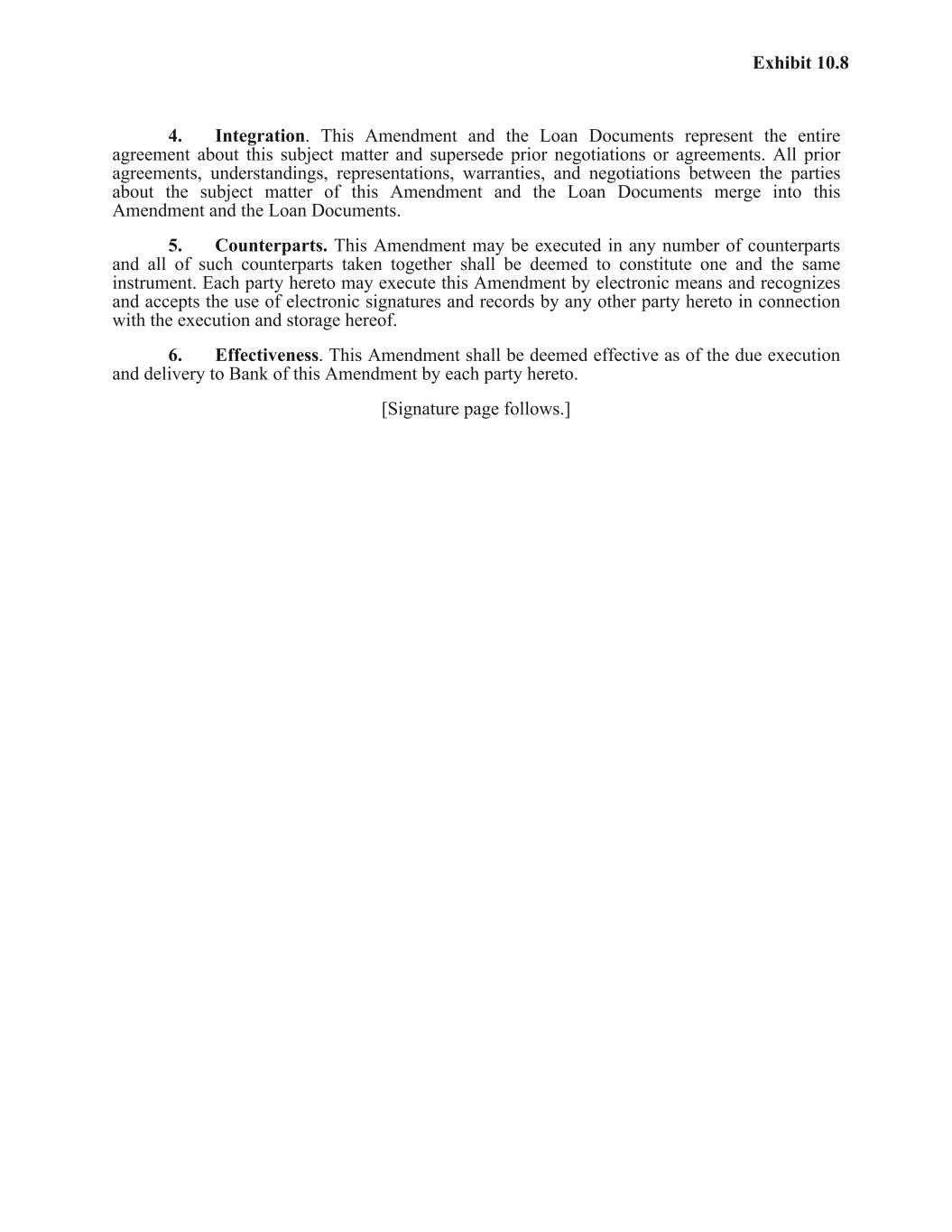 4. Integration. This Amendment and the Loan Documents represent the entire agreement about this subject matter and supersede prior negotiations or agreements. All prior agreements, understandings, representations, warranties, and negotiations between the parties about the subject matter of this Amendment and the Loan Documents merge into this Amendment and the Loan Documents. 5. Counterparts. This Amendment may be executed in any number of counterparts and all of such counterparts taken together shall be deemed to constitute one and the same instrument. Each party hereto may execute this Amendment by electronic means and recognizes and accepts the use of electronic signatures and records by any other party hereto in connection with the execution and storage hereof. 6. Effectiveness. This Amendment shall be deemed effective as of the due execution and delivery to Bank of this Amendment by each party hereto. [Signature page follows.] Exhibit 10.8