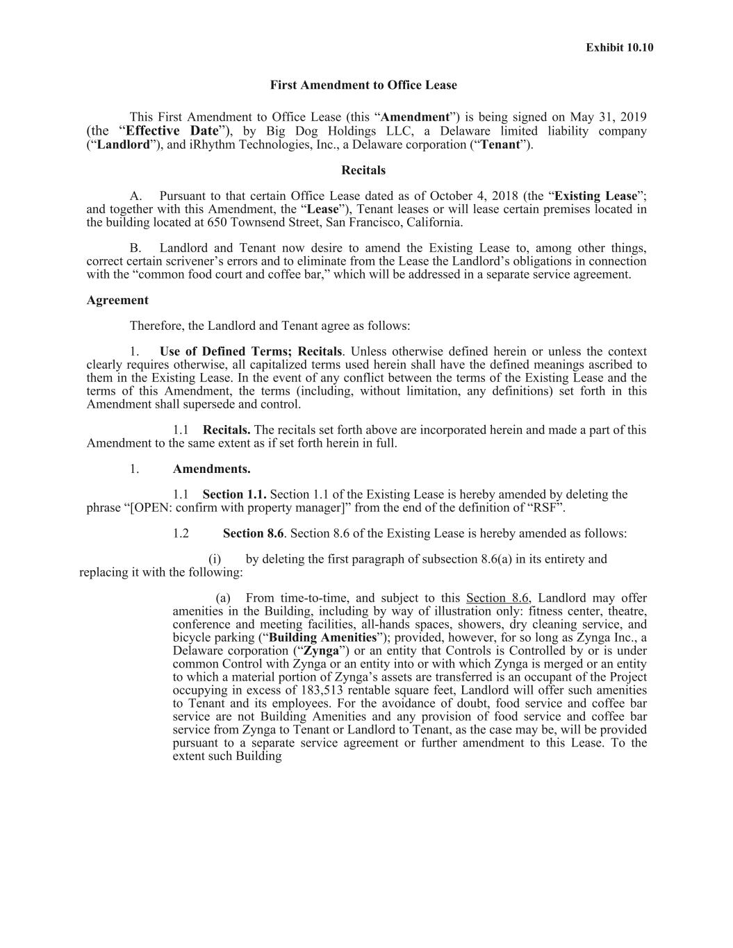 First Amendment to Office Lease This First Amendment to Office Lease (this “Amendment”) is being signed on May 31, 2019 (the “Effective Date”), by Big Dog Holdings LLC, a Delaware limited liability company (“Landlord”), and iRhythm Technologies, Inc., a Delaware corporation (“Tenant”). Recitals A. Pursuant to that certain Office Lease dated as of October 4, 2018 (the “Existing Lease”; and together with this Amendment, the “Lease”), Tenant leases or will lease certain premises located in the building located at 650 Townsend Street, San Francisco, California. B. Landlord and Tenant now desire to amend the Existing Lease to, among other things, correct certain scrivener’s errors and to eliminate from the Lease the Landlord’s obligations in connection with the “common food court and coffee bar,” which will be addressed in a separate service agreement. Agreement Therefore, the Landlord and Tenant agree as follows: 1. Use of Defined Terms; Recitals. Unless otherwise defined herein or unless the context clearly requires otherwise, all capitalized terms used herein shall have the defined meanings ascribed to them in the Existing Lease. In the event of any conflict between the terms of the Existing Lease and the terms of this Amendment, the terms (including, without limitation, any definitions) set forth in this Amendment shall supersede and control. 1.1 Recitals. The recitals set forth above are incorporated herein and made a part of this Amendment to the same extent as if set forth herein in full. 1. Amendments. 1.1 Section 1.1. Section 1.1 of the Existing Lease is hereby amended by deleting the phrase “[OPEN: confirm with property manager]” from the end of the definition of “RSF”. 1.2 Section 8.6. Section 8.6 of the Existing Lease is hereby amended as follows: (i) by deleting the first paragraph of subsection 8.6(a) in its entirety and replacing it with the following: (a) From time-to-time, and subject to this Section 8.6, Landlord may offer amenities in the Building, including by way of illustration only: fitness center, theatre, conference and meeting facilities, all-hands spaces, showers, dry cleaning service, and bicycle parking (“Building Amenities”); provided, however, for so long as Zynga Inc., a Delaware corporation (“Zynga”) or an entity that Controls is Controlled by or is under common Control with Zynga or an entity into or with which Zynga is merged or an entity to which a material portion of Zynga’s assets are transferred is an occupant of the Project occupying in excess of 183,513 rentable square feet, Landlord will offer such amenities to Tenant and its employees. For the avoidance of doubt, food service and coffee bar service are not Building Amenities and any provision of food service and coffee bar service from Zynga to Tenant or Landlord to Tenant, as the case may be, will be provided pursuant to a separate service agreement or further amendment to this Lease. To the extent such Building Exhibit 10.10
