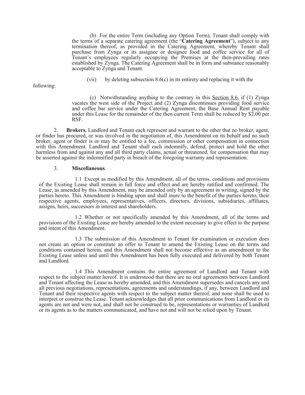 (b) For the entire Term (including any Option Term), Tenant shall comply with the terms of a separate catering agreement (the “Catering Agreement”), subject to any termination thereof, as provided in the Catering Agreement, whereby Tenant shall purchase from Zynga or its assignee or designee food and coffee service for all of Tenant’s employees regularly occupying the Premises at the then-prevailing rates established by Zynga. The Catering Agreement shall be in form and substance reasonably acceptable to Zynga and Tenant. (vii) by deleting subsection 8.6(c) in its entirety and replacing it with the following: (c) Notwithstanding anything to the contrary in this Section 8.6, if (1) Zynga vacates the west side of the Project and (2) Zynga discontinues providing food service and coffee bar service under the Catering Agreement, the Base Annual Rent payable under this Lease for the remainder of the then current Term shall be reduced by $2.00 per RSF. 2. Brokers. Landlord and Tenant each represent and warrant to the other that no broker, agent, or finder has procured, or was involved in the negotiation of, this Amendment on its behalf and no such broker, agent or finder is or may be entitled to a fee, commission or other compensation in connection with this Amendment. Landlord and Tenant shall each indemnify, defend, protect and hold the other harmless from and against any and all third party claims, actual or threatened, for compensation that may be asserted against the indemnified party in breach of the foregoing warranty and representation. 3. Miscellaneous. 1.1 Except as modified by this Amendment, all of the terms, conditions and provisions of the Existing Lease shall remain in full force and effect and are hereby ratified and confirmed. The Lease, as amended by this Amendment, may be amended only by an agreement in writing, signed by the parties hereto. This Amendment is binding upon and shall inure to the benefit of the parties hereto, their respective agents, employees, representatives, officers, directors, divisions, subsidiaries, affiliates, assigns, heirs, successors in interest and shareholders. 1.2 Whether or not specifically amended by this Amendment, all of the terms and provisions of the Existing Lease are hereby amended to the extent necessary to give effect to the purpose and intent of this Amendment. 1.3 The submission of this Amendment to Tenant for examination or execution does not create an option or constitute an offer to Tenant to amend the Existing Lease on the terms and conditions contained herein, and this Amendment shall not become effective as an amendment to the Existing Lease unless and until this Amendment has been fully executed and delivered by both Tenant and Landlord. 1.4 This Amendment contains the entire agreement of Landlord and Tenant with respect to the subject matter hereof. It is understood that there are no oral agreements between Landlord and Tenant affecting the Lease as hereby amended, and this Amendment supersedes and cancels any and all previous negotiations, representations, agreements and understandings, if any, between Landlord and Tenant and their respective agents with respect to the subject matter thereof, and none shall be used to interpret or construe the Lease. Tenant acknowledges that all prior communications from Landlord or its agents are not and were not, and shall not be construed to be, representations or warranties of Landlord or its agents as to the matters communicated, and have not and will not be relied upon by Tenant.