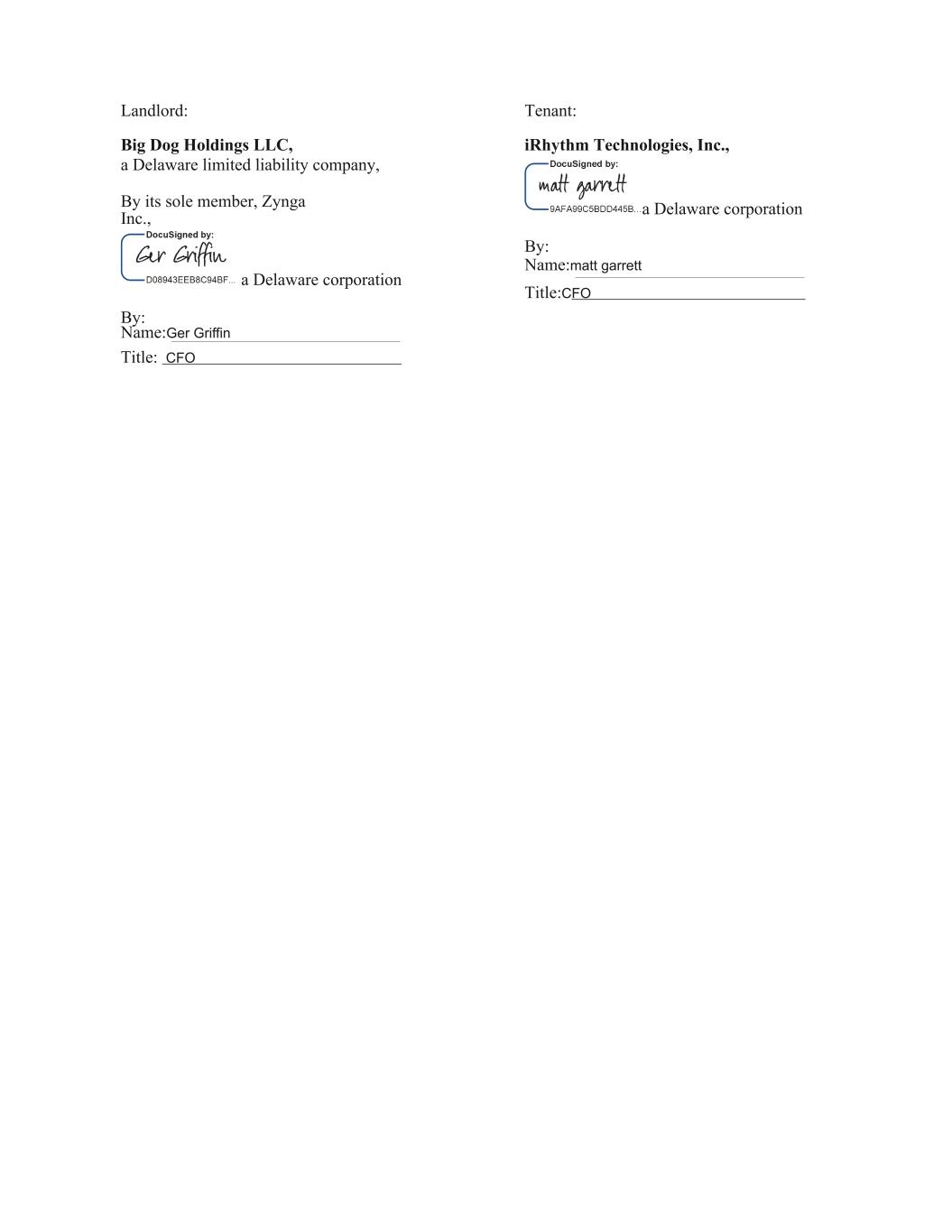 Landlord: Big Dog Holdings LLC, a Delaware limited liability company, By its sole member, Zynga Inc., a Delaware corporation By: Name:Ger Griffin Title: CFO Tenant: iRhythm Technologies, Inc., a Delaware corporation By: Name:matt garrett Title:CFO