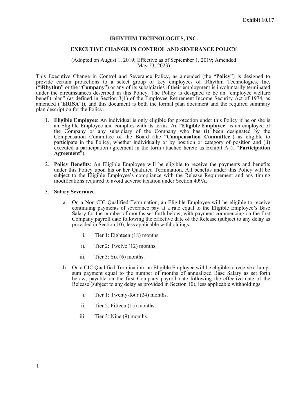 IRHYTHM TECHNOLOGIES, INC. EXECUTIVE CHANGE IN CONTROL AND SEVERANCE POLICY (Adopted on August 1, 2019; Effective as of September 1, 2019; Amended May 23, 2023) This Executive Change in Control and Severance Policy, as amended (the “Policy”) is designed to provide certain protections to a select group of key employees of iRhythm Technologies, Inc. (“iRhythm” or the “Company”) or any of its subsidiaries if their employment is involuntarily terminated under the circumstances described in this Policy. The Policy is designed to be an “employee welfare benefit plan” (as defined in Section 3(1) of the Employee Retirement Income Security Act of 1974, as amended (“ERISA”)), and this document is both the formal plan document and the required summary plan description for the Policy. 1. Eligible Employee: An individual is only eligible for protection under this Policy if he or she is an Eligible Employee and complies with its terms. An “Eligible Employee” is an employee of the Company or any subsidiary of the Company who has (i) been designated by the Compensation Committee of the Board (the “Compensation Committee”) as eligible to participate in the Policy, whether individually or by position or category of position and (ii) executed a participation agreement in the form attached hereto as Exhibit A (a “Participation Agreement”). 2. Policy Benefits: An Eligible Employee will be eligible to receive the payments and benefits under this Policy upon his or her Qualified Termination. All benefits under this Policy will be subject to the Eligible Employee’s compliance with the Release Requirement and any timing modifications required to avoid adverse taxation under Section 409A. 3. Salary Severance. a. On a Non-CIC Qualified Termination, an Eligible Employee will be eligible to receive continuing payments of severance pay at a rate equal to the Eligible Employee’s Base Salary for the number of months set forth below, with payment commencing on the first Company payroll date following the effective date of the Release (subject to any delay as provided in Section 10), less applicable withholdings. i. Tier 1: Eighteen (18) months. ii. Tier 2: Twelve (12) months. iii. Tier 3: Six (6) months. b. On a CIC Qualified Termination, an Eligible Employee will be eligible to receive a lump- sum payment equal to the number of months of annualized Base Salary as set forth below, payable on the first Company payroll date following the effective date of the Release (subject to any delay as provided in Section 10), less applicable withholdings. i. Tier 1: Twenty-four (24) months. ii. Tier 2: Fifteen (15) months. iii. Tier 3: Nine (9) months. Exhibit 10.17 1