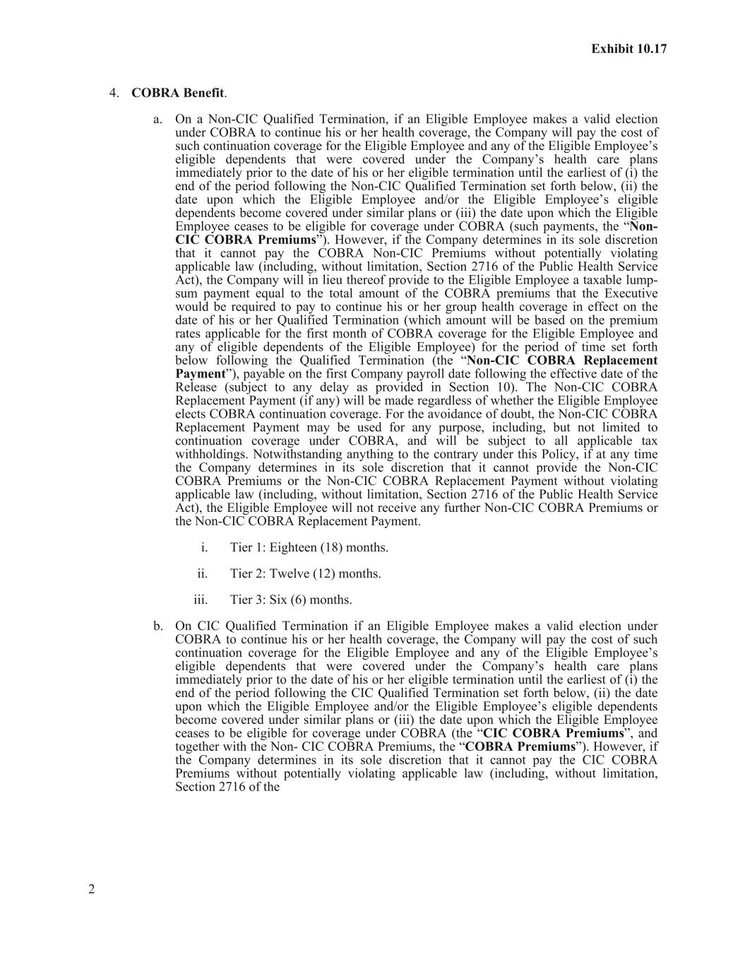 4. COBRA Benefit. a. On a Non-CIC Qualified Termination, if an Eligible Employee makes a valid election under COBRA to continue his or her health coverage, the Company will pay the cost of such continuation coverage for the Eligible Employee and any of the Eligible Employee’s eligible dependents that were covered under the Company’s health care plans immediately prior to the date of his or her eligible termination until the earliest of (i) the end of the period following the Non-CIC Qualified Termination set forth below, (ii) the date upon which the Eligible Employee and/or the Eligible Employee’s eligible dependents become covered under similar plans or (iii) the date upon which the Eligible Employee ceases to be eligible for coverage under COBRA (such payments, the “Non- CIC COBRA Premiums”). However, if the Company determines in its sole discretion that it cannot pay the COBRA Non-CIC Premiums without potentially violating applicable law (including, without limitation, Section 2716 of the Public Health Service Act), the Company will in lieu thereof provide to the Eligible Employee a taxable lump- sum payment equal to the total amount of the COBRA premiums that the Executive would be required to pay to continue his or her group health coverage in effect on the date of his or her Qualified Termination (which amount will be based on the premium rates applicable for the first month of COBRA coverage for the Eligible Employee and any of eligible dependents of the Eligible Employee) for the period of time set forth below following the Qualified Termination (the “Non-CIC COBRA Replacement Payment”), payable on the first Company payroll date following the effective date of the Release (subject to any delay as provided in Section 10). The Non-CIC COBRA Replacement Payment (if any) will be made regardless of whether the Eligible Employee elects COBRA continuation coverage. For the avoidance of doubt, the Non-CIC COBRA Replacement Payment may be used for any purpose, including, but not limited to continuation coverage under COBRA, and will be subject to all applicable tax withholdings. Notwithstanding anything to the contrary under this Policy, if at any time the Company determines in its sole discretion that it cannot provide the Non-CIC COBRA Premiums or the Non-CIC COBRA Replacement Payment without violating applicable law (including, without limitation, Section 2716 of the Public Health Service Act), the Eligible Employee will not receive any further Non-CIC COBRA Premiums or the Non-CIC COBRA Replacement Payment. i. Tier 1: Eighteen (18) months. ii. Tier 2: Twelve (12) months. iii. Tier 3: Six (6) months. b. On CIC Qualified Termination if an Eligible Employee makes a valid election under COBRA to continue his or her health coverage, the Company will pay the cost of such continuation coverage for the Eligible Employee and any of the Eligible Employee’s eligible dependents that were covered under the Company’s health care plans immediately prior to the date of his or her eligible termination until the earliest of (i) the end of the period following the CIC Qualified Termination set forth below, (ii) the date upon which the Eligible Employee and/or the Eligible Employee’s eligible dependents become covered under similar plans or (iii) the date upon which the Eligible Employee ceases to be eligible for coverage under COBRA (the “CIC COBRA Premiums”, and together with the Non- CIC COBRA Premiums, the “COBRA Premiums”). However, if the Company determines in its sole discretion that it cannot pay the CIC COBRA Premiums without potentially violating applicable law (including, without limitation, Section 2716 of the Exhibit 10.17 2