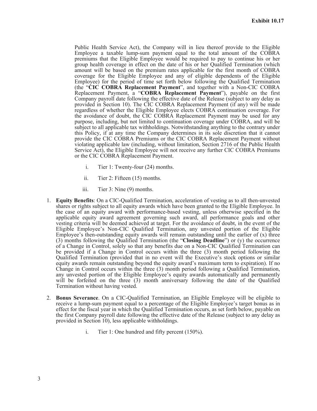 Public Health Service Act), the Company will in lieu thereof provide to the Eligible Employee a taxable lump-sum payment equal to the total amount of the COBRA premiums that the Eligible Employee would be required to pay to continue his or her group health coverage in effect on the date of his or her Qualified Termination (which amount will be based on the premium rates applicable for the first month of COBRA coverage for the Eligible Employee and any of eligible dependents of the Eligible Employee) for the period of time set forth below following the Qualified Termination (the “CIC COBRA Replacement Payment”, and together with a Non-CIC COBRA Replacement Payment, a “COBRA Replacement Payment”), payable on the first Company payroll date following the effective date of the Release (subject to any delay as provided in Section 10). The CIC COBRA Replacement Payment (if any) will be made regardless of whether the Eligible Employee elects COBRA continuation coverage. For the avoidance of doubt, the CIC COBRA Replacement Payment may be used for any purpose, including, but not limited to continuation coverage under COBRA, and will be subject to all applicable tax withholdings. Notwithstanding anything to the contrary under this Policy, if at any time the Company determines in its sole discretion that it cannot provide the CIC COBRA Premiums or the CIC COBRA Replacement Payment without violating applicable law (including, without limitation, Section 2716 of the Public Health Service Act), the Eligible Employee will not receive any further CIC COBRA Premiums or the CIC COBRA Replacement Payment. i. Tier 1: Twenty-four (24) months. ii. Tier 2: Fifteen (15) months. iii. Tier 3: Nine (9) months. 1. Equity Benefits: On a CIC-Qualified Termination, acceleration of vesting as to all then-unvested shares or rights subject to all equity awards which have been granted to the Eligible Employee. In the case of an equity award with performance-based vesting, unless otherwise specified in the applicable equity award agreement governing such award, all performance goals and other vesting criteria will be deemed achieved at target. For the avoidance of doubt, in the event of the Eligible Employee’s Non-CIC Qualified Termination, any unvested portion of the Eligible Employee’s then-outstanding equity awards will remain outstanding until the earlier of (x) three (3) months following the Qualified Termination (the “Closing Deadline”) or (y) the occurrence of a Change in Control, solely so that any benefits due on a Non-CIC Qualified Termination can be provided if a Change in Control occurs within the three (3) month period following the Qualified Termination (provided that in no event will the Executive’s stock options or similar equity awards remain outstanding beyond the equity award’s maximum term to expiration). If no Change in Control occurs within the three (3) month period following a Qualified Termination, any unvested portion of the Eligible Employee’s equity awards automatically and permanently will be forfeited on the three (3) month anniversary following the date of the Qualified Termination without having vested. 2. Bonus Severance. On a CIC-Qualified Termination, an Eligible Employee will be eligible to receive a lump-sum payment equal to a percentage of the Eligible Employee’s target bonus as in effect for the fiscal year in which the Qualified Termination occurs, as set forth below, payable on the first Company payroll date following the effective date of the Release (subject to any delay as provided in Section 10), less applicable withholdings. i. Tier 1: One hundred and fifty percent (150%). Exhibit 10.17 3