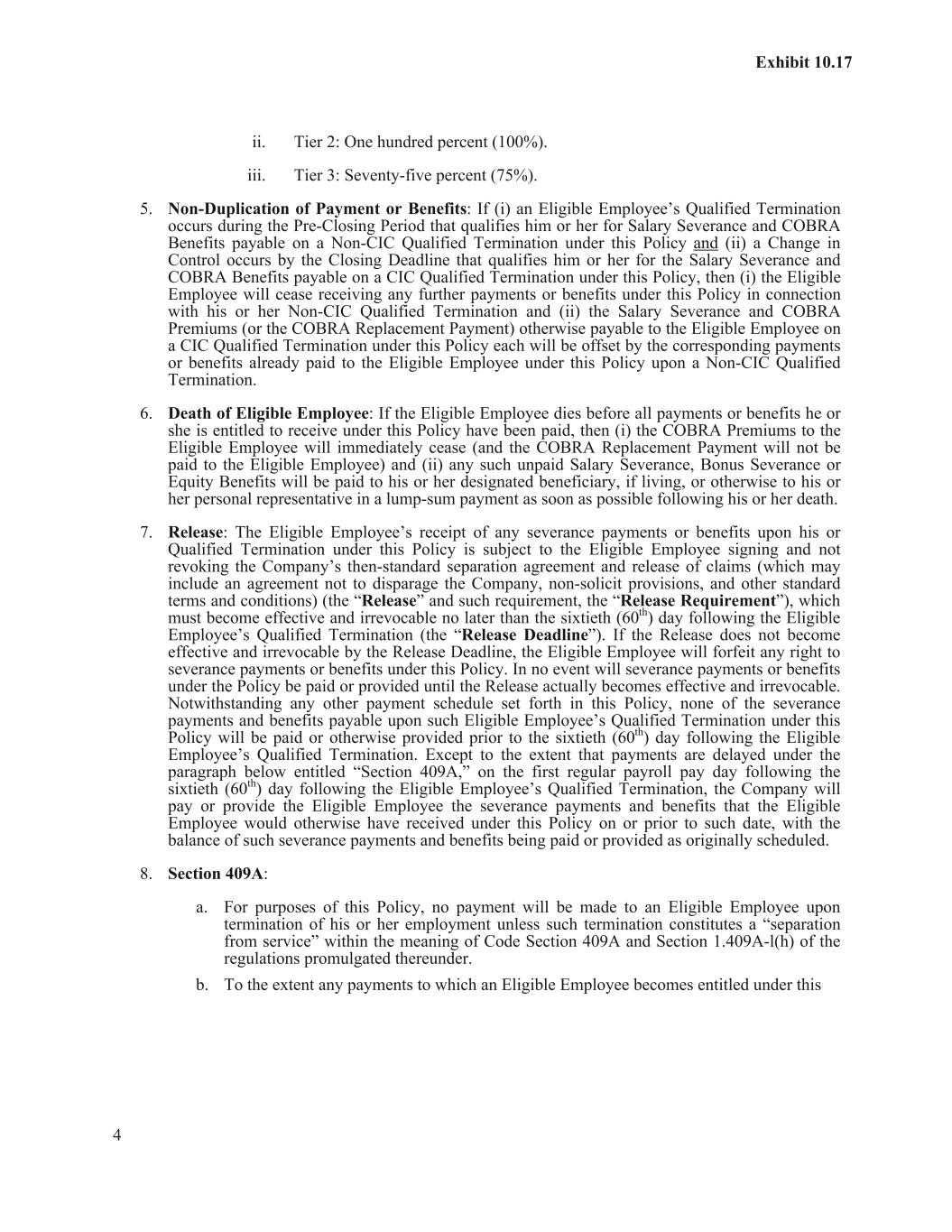 ii. Tier 2: One hundred percent (100%). iii. Tier 3: Seventy-five percent (75%). 5. Non-Duplication of Payment or Benefits: If (i) an Eligible Employee’s Qualified Termination occurs during the Pre-Closing Period that qualifies him or her for Salary Severance and COBRA Benefits payable on a Non-CIC Qualified Termination under this Policy and (ii) a Change in Control occurs by the Closing Deadline that qualifies him or her for the Salary Severance and COBRA Benefits payable on a CIC Qualified Termination under this Policy, then (i) the Eligible Employee will cease receiving any further payments or benefits under this Policy in connection with his or her Non-CIC Qualified Termination and (ii) the Salary Severance and COBRA Premiums (or the COBRA Replacement Payment) otherwise payable to the Eligible Employee on a CIC Qualified Termination under this Policy each will be offset by the corresponding payments or benefits already paid to the Eligible Employee under this Policy upon a Non-CIC Qualified Termination. 6. Death of Eligible Employee: If the Eligible Employee dies before all payments or benefits he or she is entitled to receive under this Policy have been paid, then (i) the COBRA Premiums to the Eligible Employee will immediately cease (and the COBRA Replacement Payment will not be paid to the Eligible Employee) and (ii) any such unpaid Salary Severance, Bonus Severance or Equity Benefits will be paid to his or her designated beneficiary, if living, or otherwise to his or her personal representative in a lump-sum payment as soon as possible following his or her death. 7. Release: The Eligible Employee’s receipt of any severance payments or benefits upon his or Qualified Termination under this Policy is subject to the Eligible Employee signing and not revoking the Company’s then-standard separation agreement and release of claims (which may include an agreement not to disparage the Company, non-solicit provisions, and other standard terms and conditions) (the “Release” and such requirement, the “Release Requirement”), which must become effective and irrevocable no later than the sixtieth (60th) day following the Eligible Employee’s Qualified Termination (the “Release Deadline”). If the Release does not become effective and irrevocable by the Release Deadline, the Eligible Employee will forfeit any right to severance payments or benefits under this Policy. In no event will severance payments or benefits under the Policy be paid or provided until the Release actually becomes effective and irrevocable. Notwithstanding any other payment schedule set forth in this Policy, none of the severance payments and benefits payable upon such Eligible Employee’s Qualified Termination under this Policy will be paid or otherwise provided prior to the sixtieth (60th) day following the Eligible Employee’s Qualified Termination. Except to the extent that payments are delayed under the paragraph below entitled “Section 409A,” on the first regular payroll pay day following the sixtieth (60th) day following the Eligible Employee’s Qualified Termination, the Company will pay or provide the Eligible Employee the severance payments and benefits that the Eligible Employee would otherwise have received under this Policy on or prior to such date, with the balance of such severance payments and benefits being paid or provided as originally scheduled. 8. Section 409A: a. For purposes of this Policy, no payment will be made to an Eligible Employee upon termination of his or her employment unless such termination constitutes a “separation from service” within the meaning of Code Section 409A and Section 1.409A-l(h) of the regulations promulgated thereunder. b. To the extent any payments to which an Eligible Employee becomes entitled under this Exhibit 10.17 4