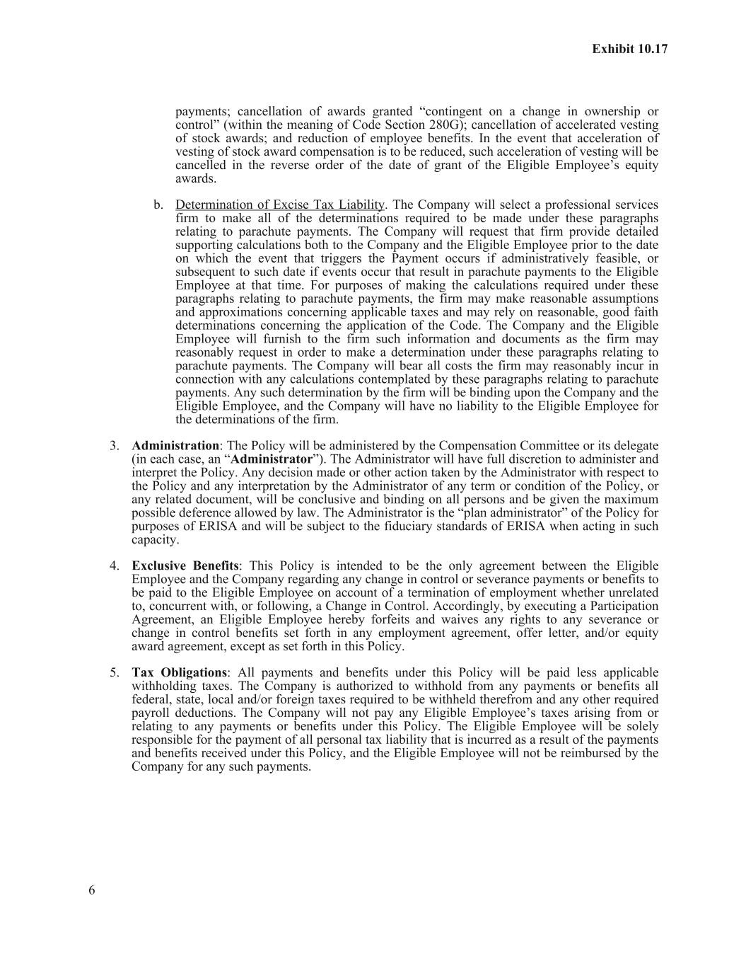 payments; cancellation of awards granted “contingent on a change in ownership or control” (within the meaning of Code Section 280G); cancellation of accelerated vesting of stock awards; and reduction of employee benefits. In the event that acceleration of vesting of stock award compensation is to be reduced, such acceleration of vesting will be cancelled in the reverse order of the date of grant of the Eligible Employee’s equity awards. b. Determination of Excise Tax Liability. The Company will select a professional services firm to make all of the determinations required to be made under these paragraphs relating to parachute payments. The Company will request that firm provide detailed supporting calculations both to the Company and the Eligible Employee prior to the date on which the event that triggers the Payment occurs if administratively feasible, or subsequent to such date if events occur that result in parachute payments to the Eligible Employee at that time. For purposes of making the calculations required under these paragraphs relating to parachute payments, the firm may make reasonable assumptions and approximations concerning applicable taxes and may rely on reasonable, good faith determinations concerning the application of the Code. The Company and the Eligible Employee will furnish to the firm such information and documents as the firm may reasonably request in order to make a determination under these paragraphs relating to parachute payments. The Company will bear all costs the firm may reasonably incur in connection with any calculations contemplated by these paragraphs relating to parachute payments. Any such determination by the firm will be binding upon the Company and the Eligible Employee, and the Company will have no liability to the Eligible Employee for the determinations of the firm. 3. Administration: The Policy will be administered by the Compensation Committee or its delegate (in each case, an “Administrator”). The Administrator will have full discretion to administer and interpret the Policy. Any decision made or other action taken by the Administrator with respect to the Policy and any interpretation by the Administrator of any term or condition of the Policy, or any related document, will be conclusive and binding on all persons and be given the maximum possible deference allowed by law. The Administrator is the “plan administrator” of the Policy for purposes of ERISA and will be subject to the fiduciary standards of ERISA when acting in such capacity. 4. Exclusive Benefits: This Policy is intended to be the only agreement between the Eligible Employee and the Company regarding any change in control or severance payments or benefits to be paid to the Eligible Employee on account of a termination of employment whether unrelated to, concurrent with, or following, a Change in Control. Accordingly, by executing a Participation Agreement, an Eligible Employee hereby forfeits and waives any rights to any severance or change in control benefits set forth in any employment agreement, offer letter, and/or equity award agreement, except as set forth in this Policy. 5. Tax Obligations: All payments and benefits under this Policy will be paid less applicable withholding taxes. The Company is authorized to withhold from any payments or benefits all federal, state, local and/or foreign taxes required to be withheld therefrom and any other required payroll deductions. The Company will not pay any Eligible Employee’s taxes arising from or relating to any payments or benefits under this Policy. The Eligible Employee will be solely responsible for the payment of all personal tax liability that is incurred as a result of the payments and benefits received under this Policy, and the Eligible Employee will not be reimbursed by the Company for any such payments. Exhibit 10.17 6