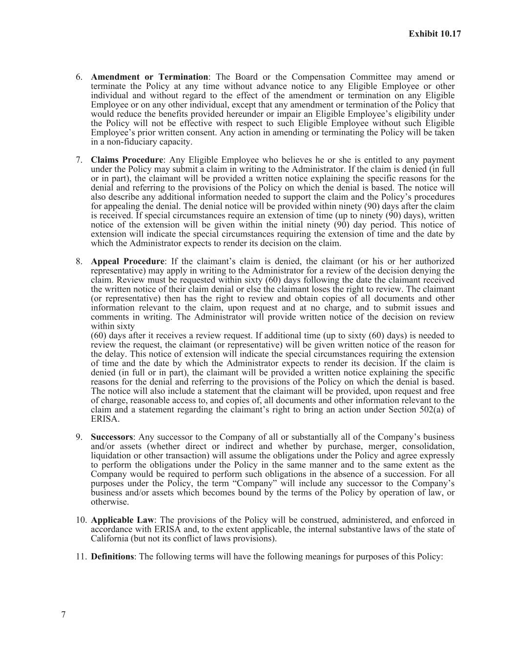 6. Amendment or Termination: The Board or the Compensation Committee may amend or terminate the Policy at any time without advance notice to any Eligible Employee or other individual and without regard to the effect of the amendment or termination on any Eligible Employee or on any other individual, except that any amendment or termination of the Policy that would reduce the benefits provided hereunder or impair an Eligible Employee’s eligibility under the Policy will not be effective with respect to such Eligible Employee without such Eligible Employee’s prior written consent. Any action in amending or terminating the Policy will be taken in a non-fiduciary capacity. 7. Claims Procedure: Any Eligible Employee who believes he or she is entitled to any payment under the Policy may submit a claim in writing to the Administrator. If the claim is denied (in full or in part), the claimant will be provided a written notice explaining the specific reasons for the denial and referring to the provisions of the Policy on which the denial is based. The notice will also describe any additional information needed to support the claim and the Policy’s procedures for appealing the denial. The denial notice will be provided within ninety (90) days after the claim is received. If special circumstances require an extension of time (up to ninety (90) days), written notice of the extension will be given within the initial ninety (90) day period. This notice of extension will indicate the special circumstances requiring the extension of time and the date by which the Administrator expects to render its decision on the claim. 8. Appeal Procedure: If the claimant’s claim is denied, the claimant (or his or her authorized representative) may apply in writing to the Administrator for a review of the decision denying the claim. Review must be requested within sixty (60) days following the date the claimant received the written notice of their claim denial or else the claimant loses the right to review. The claimant (or representative) then has the right to review and obtain copies of all documents and other information relevant to the claim, upon request and at no charge, and to submit issues and comments in writing. The Administrator will provide written notice of the decision on review within sixty (60) days after it receives a review request. If additional time (up to sixty (60) days) is needed to review the request, the claimant (or representative) will be given written notice of the reason for the delay. This notice of extension will indicate the special circumstances requiring the extension of time and the date by which the Administrator expects to render its decision. If the claim is denied (in full or in part), the claimant will be provided a written notice explaining the specific reasons for the denial and referring to the provisions of the Policy on which the denial is based. The notice will also include a statement that the claimant will be provided, upon request and free of charge, reasonable access to, and copies of, all documents and other information relevant to the claim and a statement regarding the claimant’s right to bring an action under Section 502(a) of ERISA. 9. Successors: Any successor to the Company of all or substantially all of the Company’s business and/or assets (whether direct or indirect and whether by purchase, merger, consolidation, liquidation or other transaction) will assume the obligations under the Policy and agree expressly to perform the obligations under the Policy in the same manner and to the same extent as the Company would be required to perform such obligations in the absence of a succession. For all purposes under the Policy, the term “Company” will include any successor to the Company’s business and/or assets which becomes bound by the terms of the Policy by operation of law, or otherwise. 10. Applicable Law: The provisions of the Policy will be construed, administered, and enforced in accordance with ERISA and, to the extent applicable, the internal substantive laws of the state of California (but not its conflict of laws provisions). 11. Definitions: The following terms will have the following meanings for purposes of this Policy: Exhibit 10.17 7