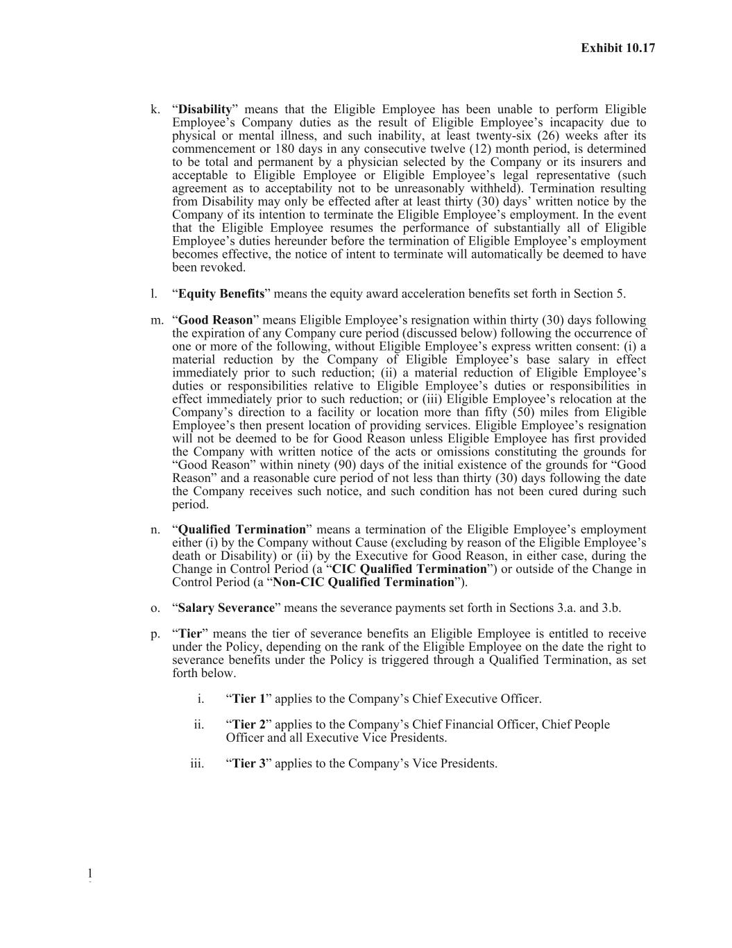 k. “Disability” means that the Eligible Employee has been unable to perform Eligible Employee’s Company duties as the result of Eligible Employee’s incapacity due to physical or mental illness, and such inability, at least twenty-six (26) weeks after its commencement or 180 days in any consecutive twelve (12) month period, is determined to be total and permanent by a physician selected by the Company or its insurers and acceptable to Eligible Employee or Eligible Employee’s legal representative (such agreement as to acceptability not to be unreasonably withheld). Termination resulting from Disability may only be effected after at least thirty (30) days’ written notice by the Company of its intention to terminate the Eligible Employee’s employment. In the event that the Eligible Employee resumes the performance of substantially all of Eligible Employee’s duties hereunder before the termination of Eligible Employee’s employment becomes effective, the notice of intent to terminate will automatically be deemed to have been revoked. l. “Equity Benefits” means the equity award acceleration benefits set forth in Section 5. m. “Good Reason” means Eligible Employee’s resignation within thirty (30) days following the expiration of any Company cure period (discussed below) following the occurrence of one or more of the following, without Eligible Employee’s express written consent: (i) a material reduction by the Company of Eligible Employee’s base salary in effect immediately prior to such reduction; (ii) a material reduction of Eligible Employee’s duties or responsibilities relative to Eligible Employee’s duties or responsibilities in effect immediately prior to such reduction; or (iii) Eligible Employee’s relocation at the Company’s direction to a facility or location more than fifty (50) miles from Eligible Employee’s then present location of providing services. Eligible Employee’s resignation will not be deemed to be for Good Reason unless Eligible Employee has first provided the Company with written notice of the acts or omissions constituting the grounds for “Good Reason” within ninety (90) days of the initial existence of the grounds for “Good Reason” and a reasonable cure period of not less than thirty (30) days following the date the Company receives such notice, and such condition has not been cured during such period. n. “Qualified Termination” means a termination of the Eligible Employee’s employment either (i) by the Company without Cause (excluding by reason of the Eligible Employee’s death or Disability) or (ii) by the Executive for Good Reason, in either case, during the Change in Control Period (a “CIC Qualified Termination”) or outside of the Change in Control Period (a “Non-CIC Qualified Termination”). o. “Salary Severance” means the severance payments set forth in Sections 3.a. and 3.b. p. “Tier” means the tier of severance benefits an Eligible Employee is entitled to receive under the Policy, depending on the rank of the Eligible Employee on the date the right to severance benefits under the Policy is triggered through a Qualified Termination, as set forth below. i. “Tier 1” applies to the Company’s Chief Executive Officer. ii. “Tier 2” applies to the Company’s Chief Financial Officer, Chief People Officer and all Executive Vice Presidents. iii. “Tier 3” applies to the Company’s Vice Presidents. Exhibit 10.17 1 0