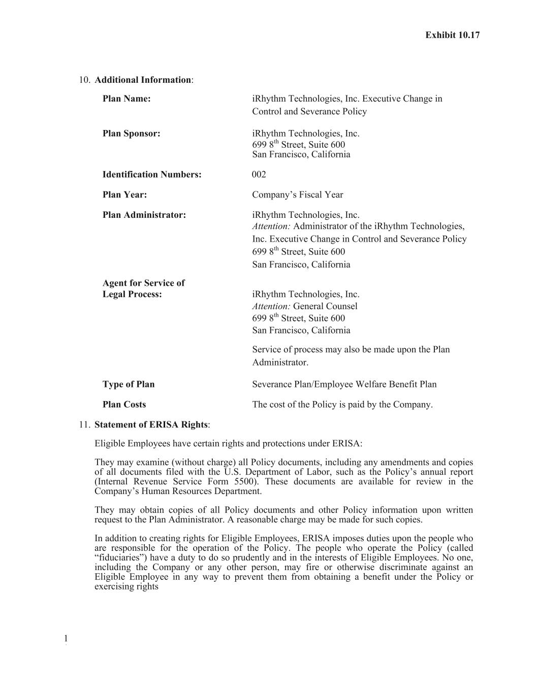 10. Additional Information: Plan Name: iRhythm Technologies, Inc. Executive Change in Control and Severance Policy Plan Sponsor: iRhythm Technologies, Inc. 699 8th Street, Suite 600 San Francisco, California Identification Numbers: 002 Plan Year: Company’s Fiscal Year Plan Administrator: iRhythm Technologies, Inc. Attention: Administrator of the iRhythm Technologies, Inc. Executive Change in Control and Severance Policy 699 8th Street, Suite 600 San Francisco, California Agent for Service of Legal Process: iRhythm Technologies, Inc. Attention: General Counsel 699 8th Street, Suite 600 San Francisco, California Service of process may also be made upon the Plan Administrator. Type of Plan Severance Plan/Employee Welfare Benefit Plan Plan Costs The cost of the Policy is paid by the Company. 11. Statement of ERISA Rights: Eligible Employees have certain rights and protections under ERISA: They may examine (without charge) all Policy documents, including any amendments and copies of all documents filed with the U.S. Department of Labor, such as the Policy’s annual report (Internal Revenue Service Form 5500). These documents are available for review in the Company’s Human Resources Department. They may obtain copies of all Policy documents and other Policy information upon written request to the Plan Administrator. A reasonable charge may be made for such copies. In addition to creating rights for Eligible Employees, ERISA imposes duties upon the people who are responsible for the operation of the Policy. The people who operate the Policy (called “fiduciaries”) have a duty to do so prudently and in the interests of Eligible Employees. No one, including the Company or any other person, may fire or otherwise discriminate against an Eligible Employee in any way to prevent them from obtaining a benefit under the Policy or exercising rights Exhibit 10.17 1 1