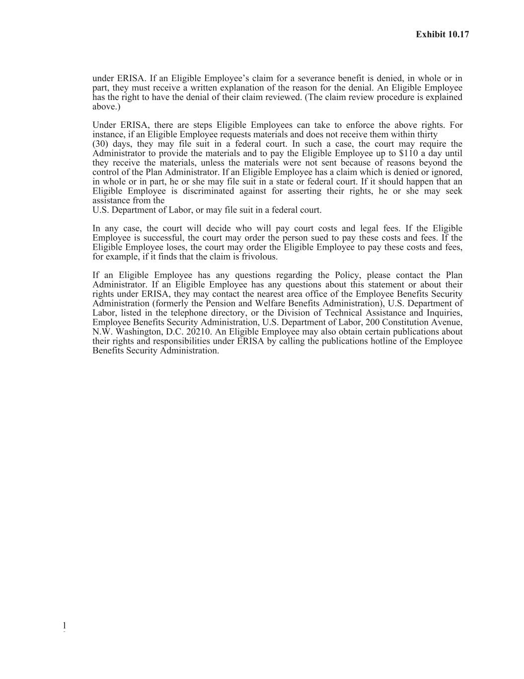 under ERISA. If an Eligible Employee’s claim for a severance benefit is denied, in whole or in part, they must receive a written explanation of the reason for the denial. An Eligible Employee has the right to have the denial of their claim reviewed. (The claim review procedure is explained above.) Under ERISA, there are steps Eligible Employees can take to enforce the above rights. For instance, if an Eligible Employee requests materials and does not receive them within thirty (30) days, they may file suit in a federal court. In such a case, the court may require the Administrator to provide the materials and to pay the Eligible Employee up to $110 a day until they receive the materials, unless the materials were not sent because of reasons beyond the control of the Plan Administrator. If an Eligible Employee has a claim which is denied or ignored, in whole or in part, he or she may file suit in a state or federal court. If it should happen that an Eligible Employee is discriminated against for asserting their rights, he or she may seek assistance from the U.S. Department of Labor, or may file suit in a federal court. In any case, the court will decide who will pay court costs and legal fees. If the Eligible Employee is successful, the court may order the person sued to pay these costs and fees. If the Eligible Employee loses, the court may order the Eligible Employee to pay these costs and fees, for example, if it finds that the claim is frivolous. If an Eligible Employee has any questions regarding the Policy, please contact the Plan Administrator. If an Eligible Employee has any questions about this statement or about their rights under ERISA, they may contact the nearest area office of the Employee Benefits Security Administration (formerly the Pension and Welfare Benefits Administration), U.S. Department of Labor, listed in the telephone directory, or the Division of Technical Assistance and Inquiries, Employee Benefits Security Administration, U.S. Department of Labor, 200 Constitution Avenue, N.W. Washington, D.C. 20210. An Eligible Employee may also obtain certain publications about their rights and responsibilities under ERISA by calling the publications hotline of the Employee Benefits Security Administration. Exhibit 10.17 1 2